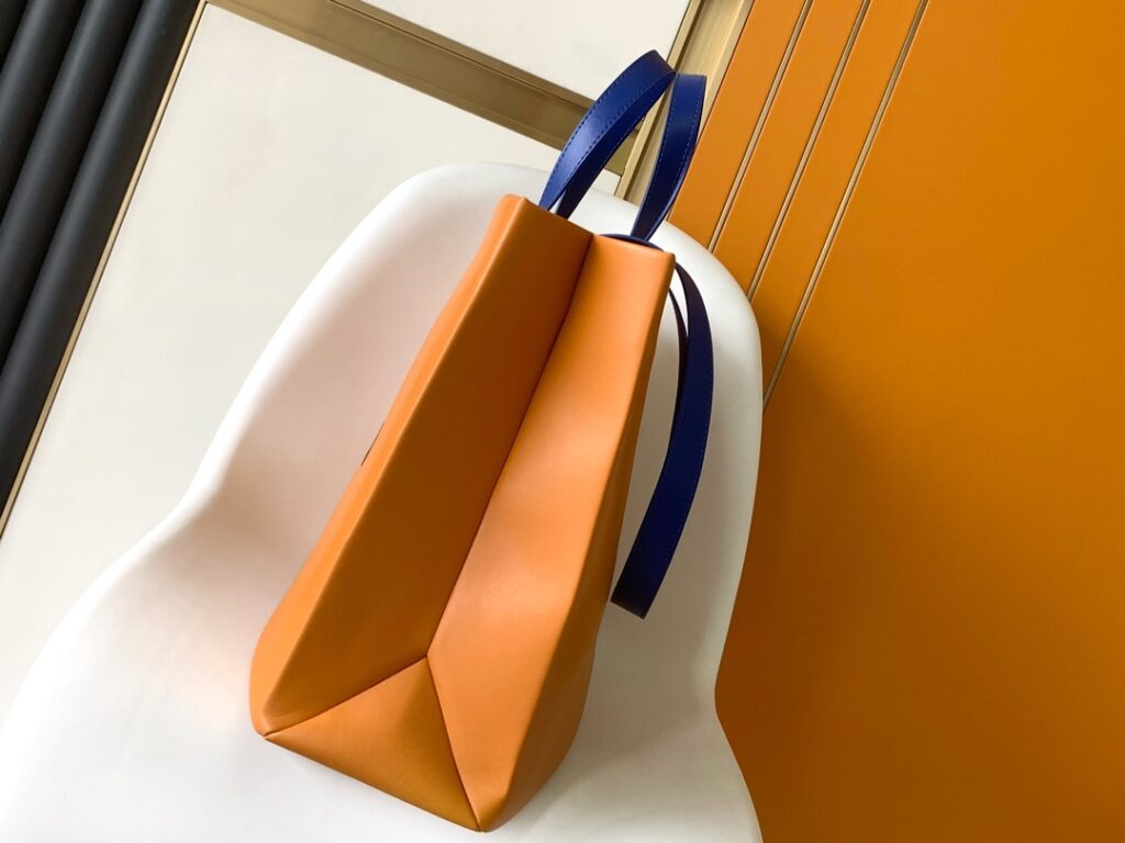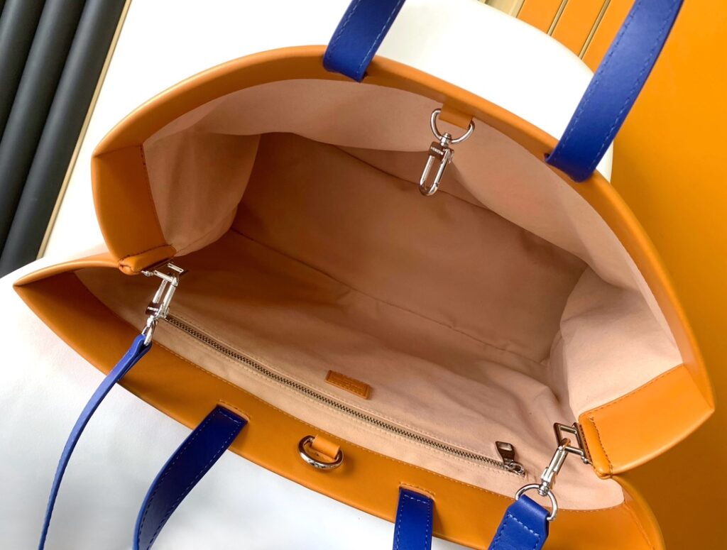 作为一款主打“顶级原单”品质的手袋,材质的选择是核心。M24457 采用了大面积的柔软牛皮,这种皮革既保留了天然的纹理质感,又拥有极佳的抗褶皱性能。橙色皮革色泽饱满,手感细腻温润;而作为对比色的蓝色手柄和肩带,则选用了韧性更高的皮革,以支撑日常通勤中的承重需求。