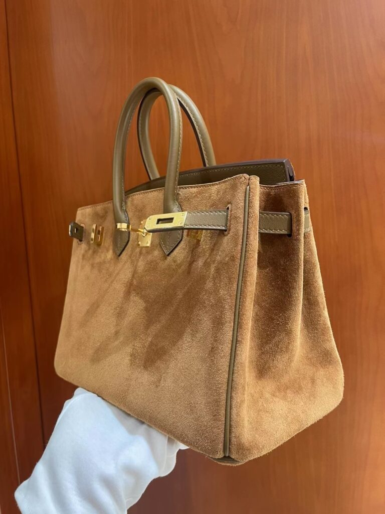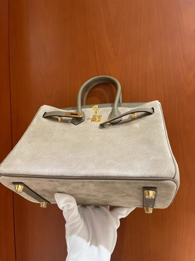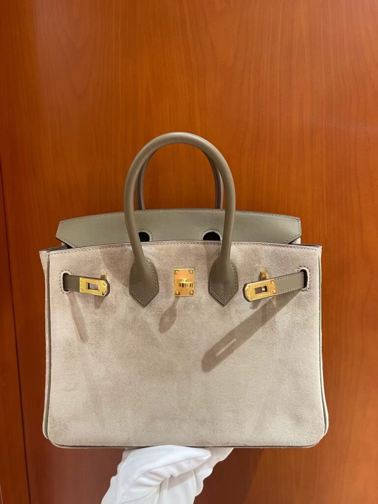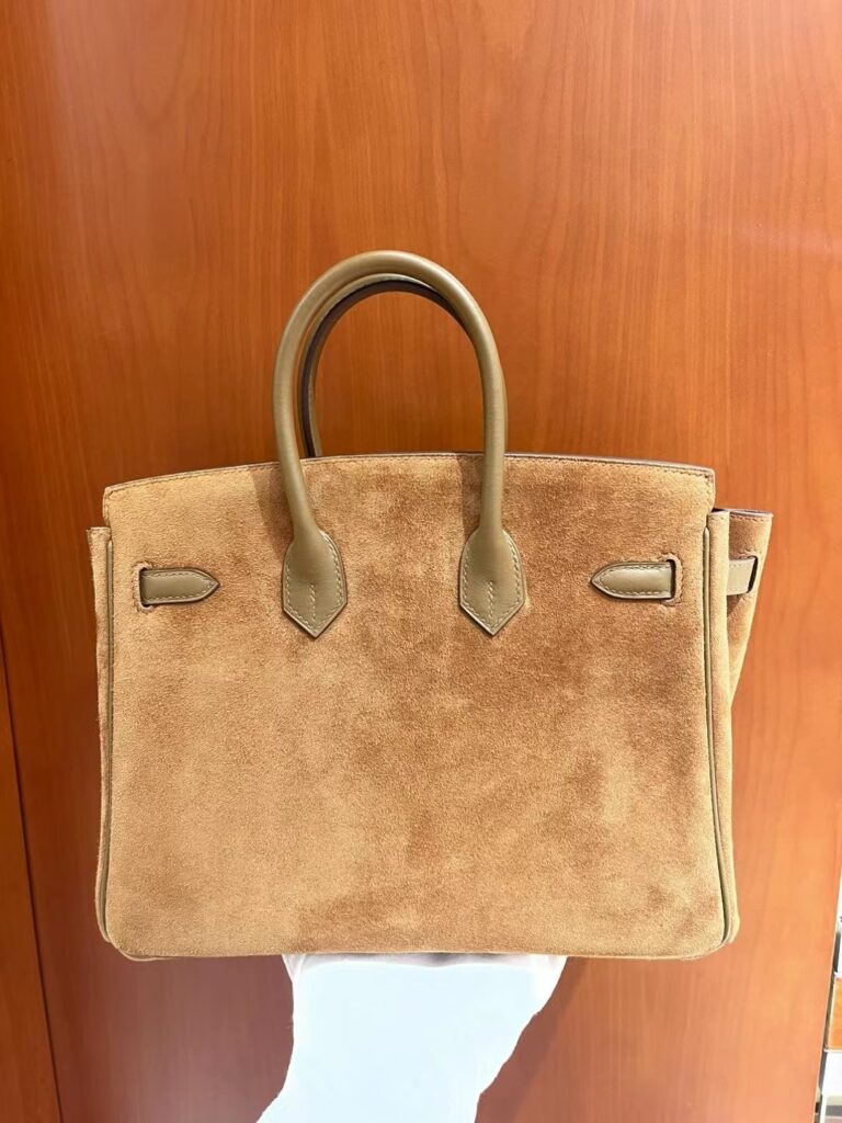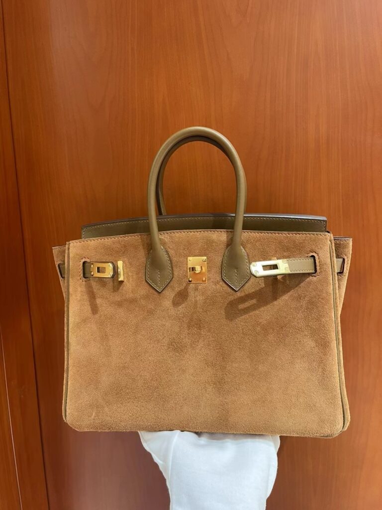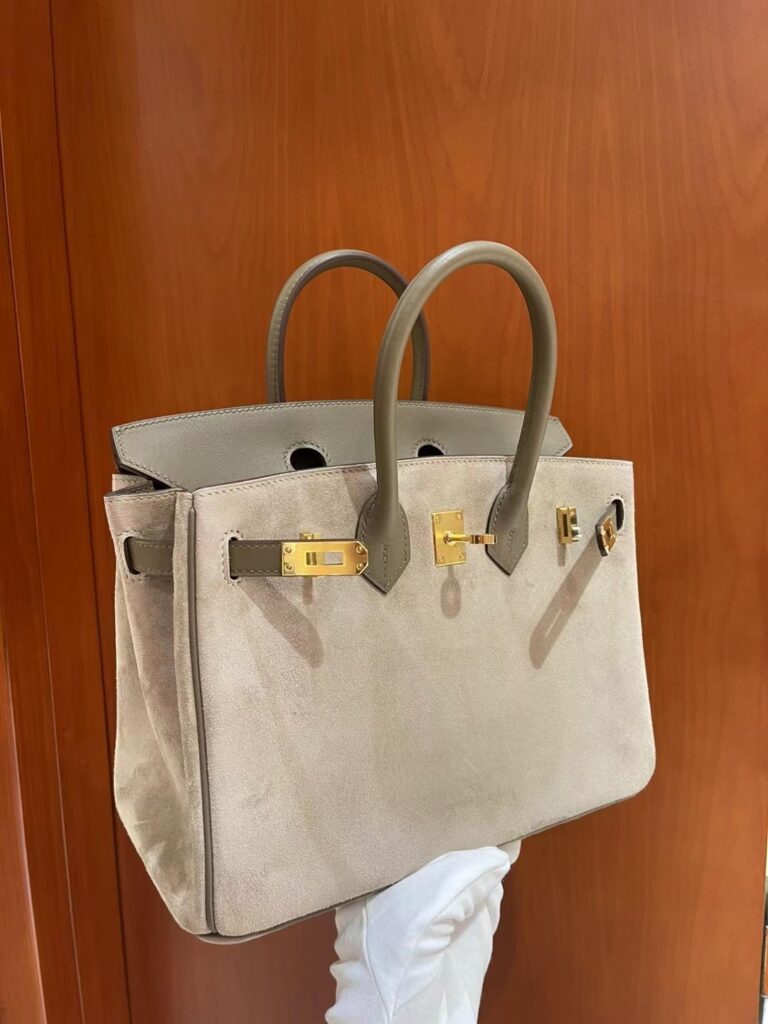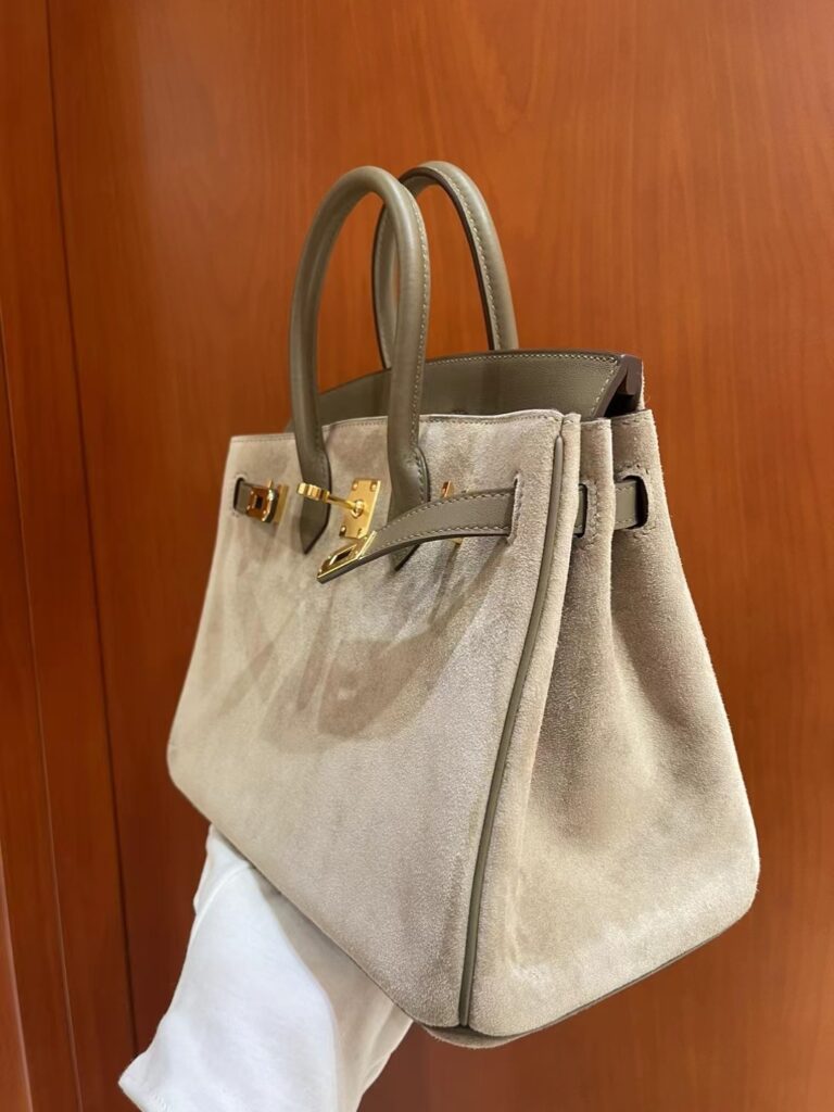 在爱马仕包袋的殿堂级收藏中,Birkin Grizzly 绝对算得上是一个“异类”,但正是这种稀缺性,让它成为了资深“养马人”梦寐以求的艺术品。这款包被亲切地称为“泰迪包”,因为它摒弃了传统全皮的硬朗感,转而采用极其细腻、触感温润的 Veau Grizzly 麂皮作为包身主体。这种材质在视觉上呈现出一种柔和的哑光质感,上手时那份如丝绒般的细腻触感,仿佛冬日里温暖的拥抱,这正是其“泰迪”称号的由来。