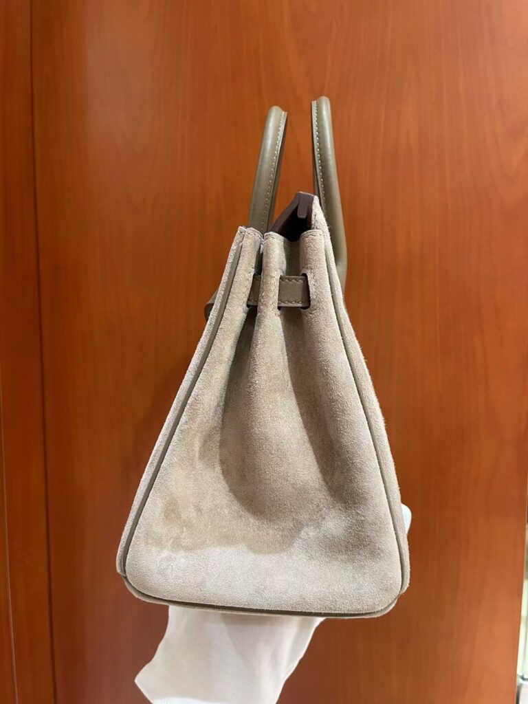 色彩方面,图中展示的两款正是爱马仕最经典的“三大金刚”色系中的金棕色与大象灰。金棕色 Grizzly 展现出一种浓郁的焦糖感,在麂皮的衬托下更显复古和高级,是秋日搭配的绝佳选择;而大象灰则多了几分清冷与知性,麂皮的颗粒感赋予了这个颜色更丰富的深浅变化,无论在阳光下还是室内,都散发着迷人的折射光泽。五金部分采用了加厚电镀技术,光泽度内敛且持久,侧边的刻印深浅适中,每一处细节都经得起放大镜级的审视。
