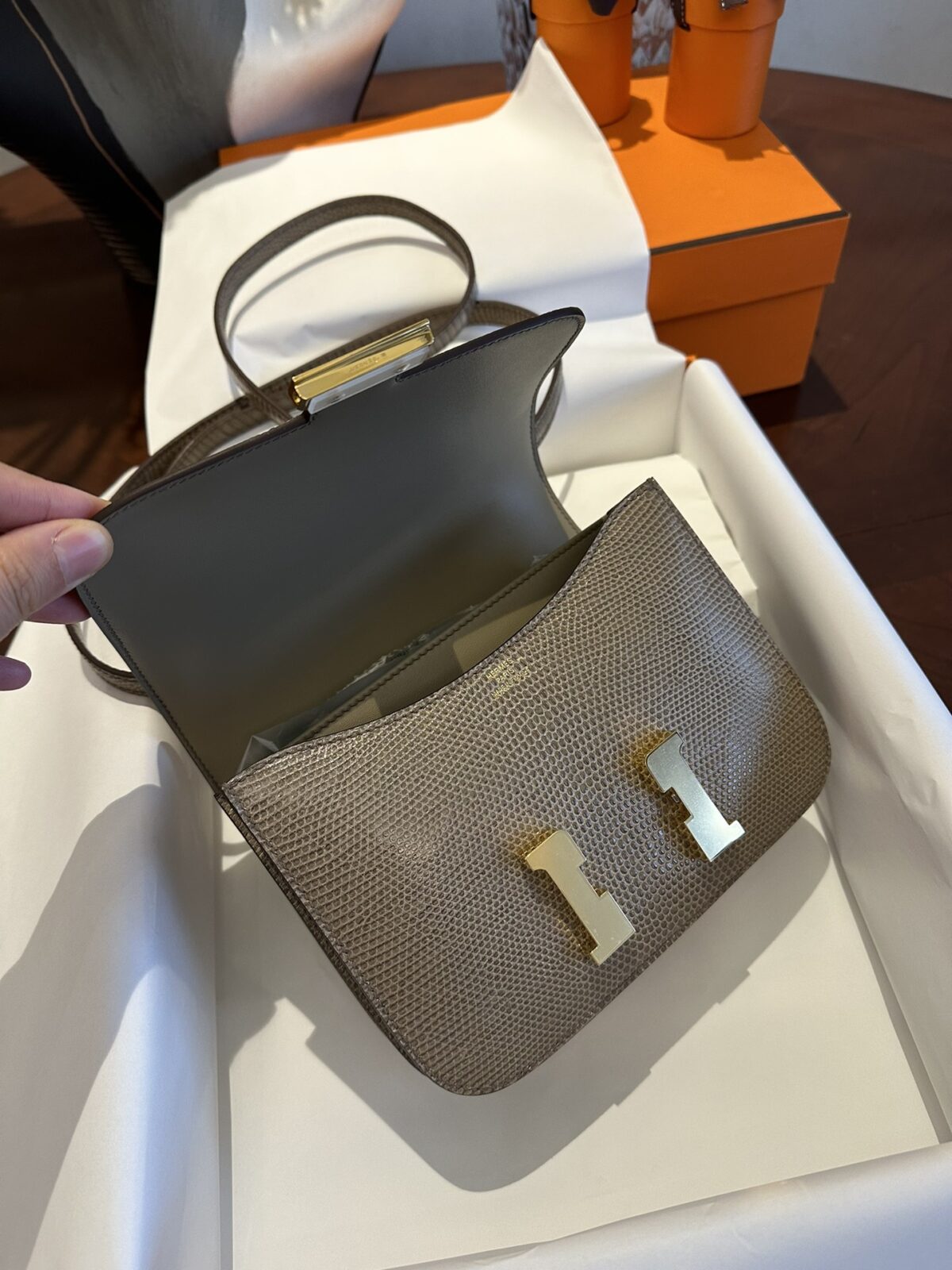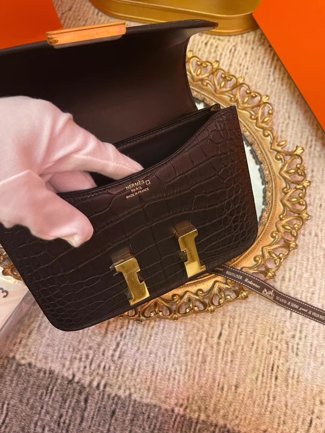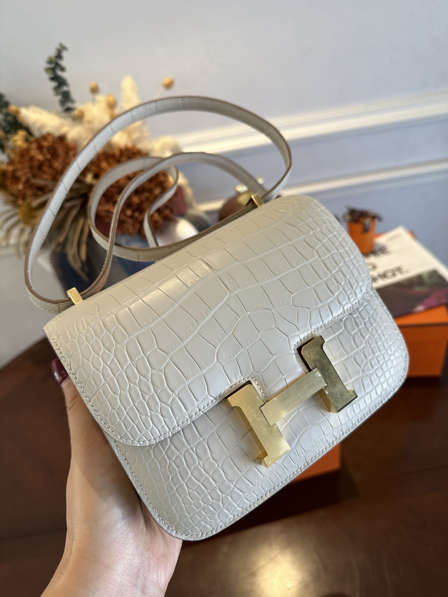产品基本参数: 这款顶奢级别的 Hermès Constance(空姐包)提供多种规格。颜色涵盖了经典的黑金、大象灰、喜马拉雅渐变白、奶昔白以及深宝石绿等;尺寸主要为最受欢迎的 Constance 18(Mini)和 Constance 24;材料选用顶级进口稀有皮,包括南非鸵鸟皮、印尼天然蜥蜴皮、以及密西西比短吻鳄鱼皮/尼罗鳄鱼皮。五金采用精钢底材,外镀 18K 真金(黄金或玫瑰金)或电镀厚层钯金,确保恒久不褪色。
