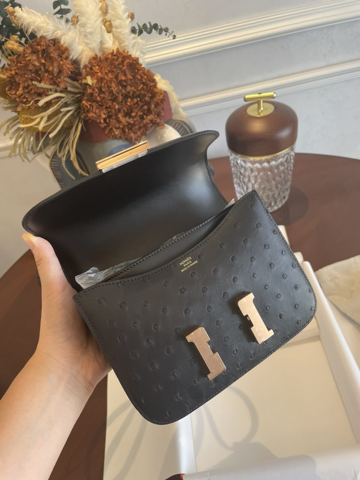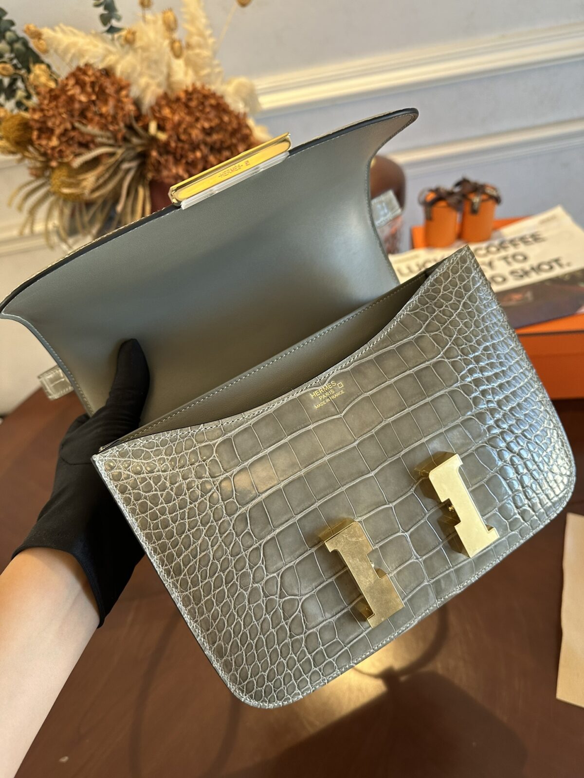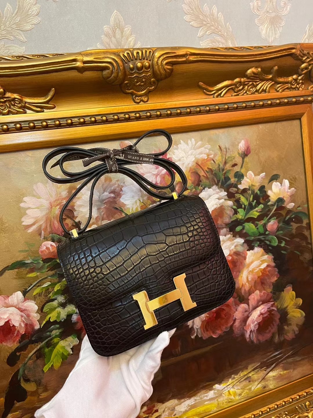 产品基本参数: 这款顶奢级别的 Hermès Constance(空姐包)提供多种规格。颜色涵盖了经典的黑金、大象灰、喜马拉雅渐变白、奶昔白以及深宝石绿等;尺寸主要为最受欢迎的 Constance 18(Mini)和 Constance 24;材料选用顶级进口稀有皮,包括南非鸵鸟皮、印尼天然蜥蜴皮、以及密西西比短吻鳄鱼皮/尼罗鳄鱼皮。五金采用精钢底材,外镀 18K 真金(黄金或玫瑰金)或电镀厚层钯金,确保恒久不褪色。