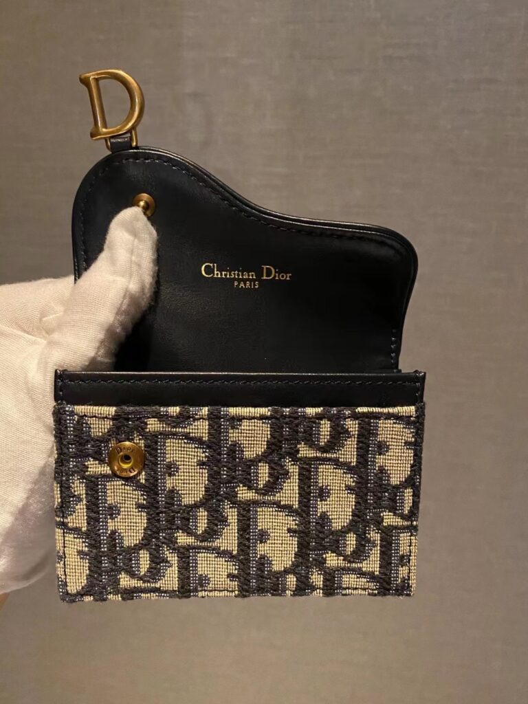 【产品参数】 品牌: 迪奥 (Christian Dior) 款式: Saddle 马鞍翻盖卡包 颜色: 经典蓝色 Oblique 提花 材质: 提花帆布 (Jacquard) 搭配顶级小牛皮内里 五金: 复古金色饰面金属 “D” 吊坠 尺寸: 11.5 x 8 x 2 厘米 结构: 1 个主隔层,2 个卡槽,1 个贴袋,按扣开合
