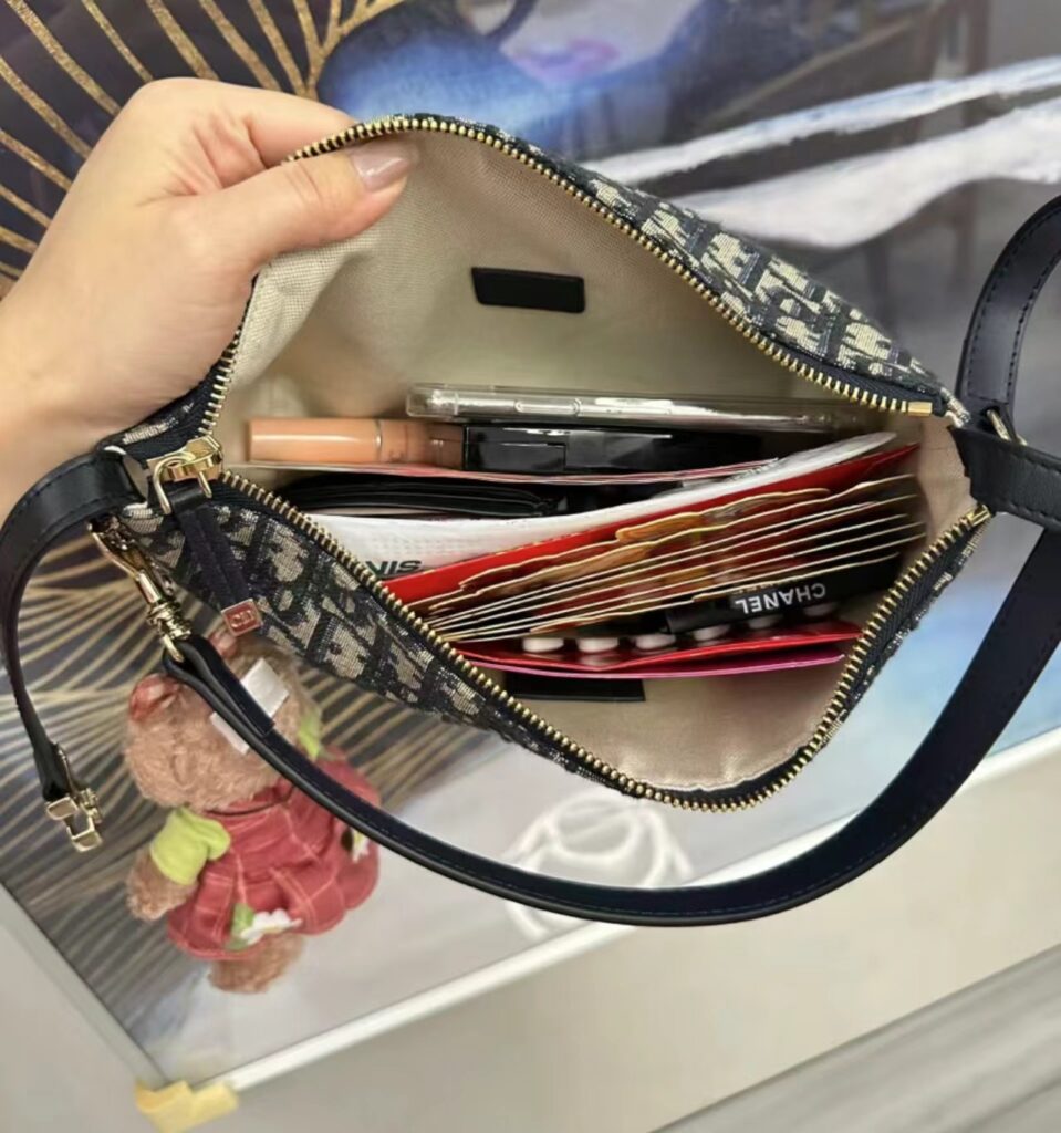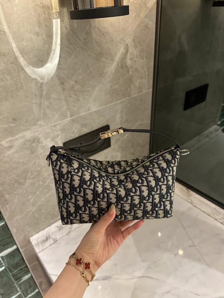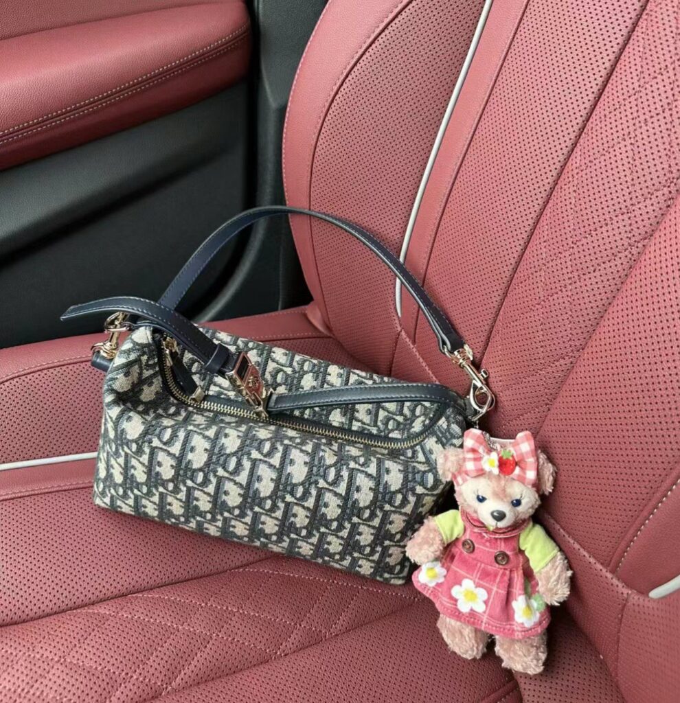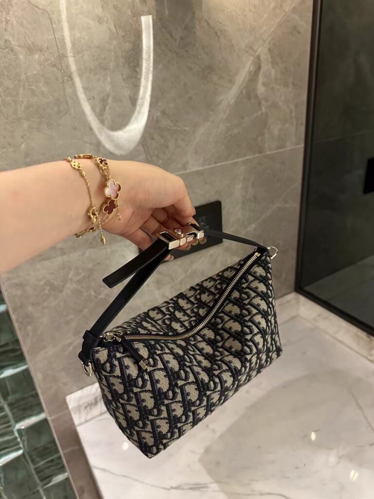 其次,五金部分也是一大亮点。我们使用的是“五金都是 QC 代工来的”原厂五金,确保了与正品完全一致的质感和重量。银色的 Dior 标志性搭扣在手柄连接处闪耀着精致的光芒,搭扣上的刻字清晰可见,力度适中,开合顺畅。拉链顶部的 Dior 小吊饰也制作得非常精细。这种对细节的极致追求,正是由于“品牌只出纯的”这一理念。