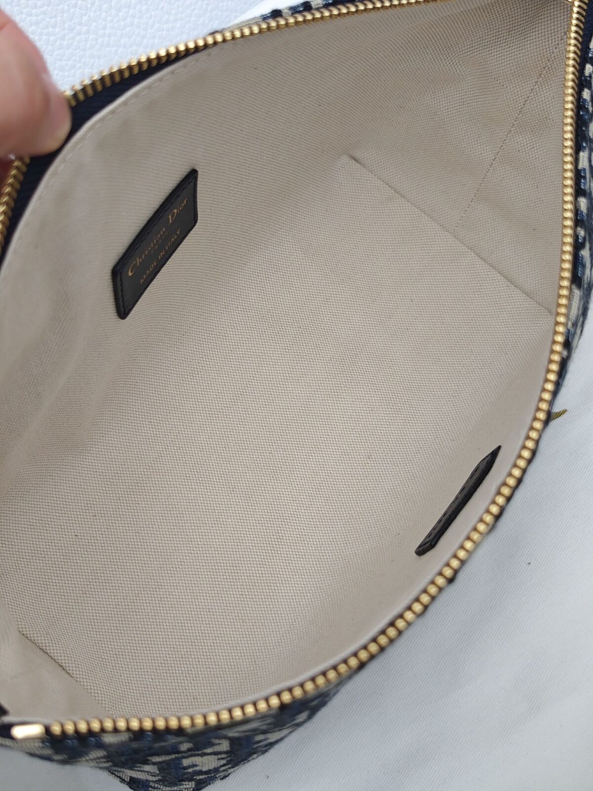经典 Oblique 印花:每一针都是艺术 这款包的核心魅力在于其蓝色的 Oblique 刺绣。我们选用的进口面料完全复刻了专柜的经纬编织密度。很多人担心印花会跑偏或者模糊,但真正的顶级版本能做到图案对称、立体感十足,且在光线下呈现出特有的丝绸光泽。这种面料不仅耐磨抗造,更具备了一定的防水性能,非常适合作为差旅途中的洗漱包或日常出行的随身包。
