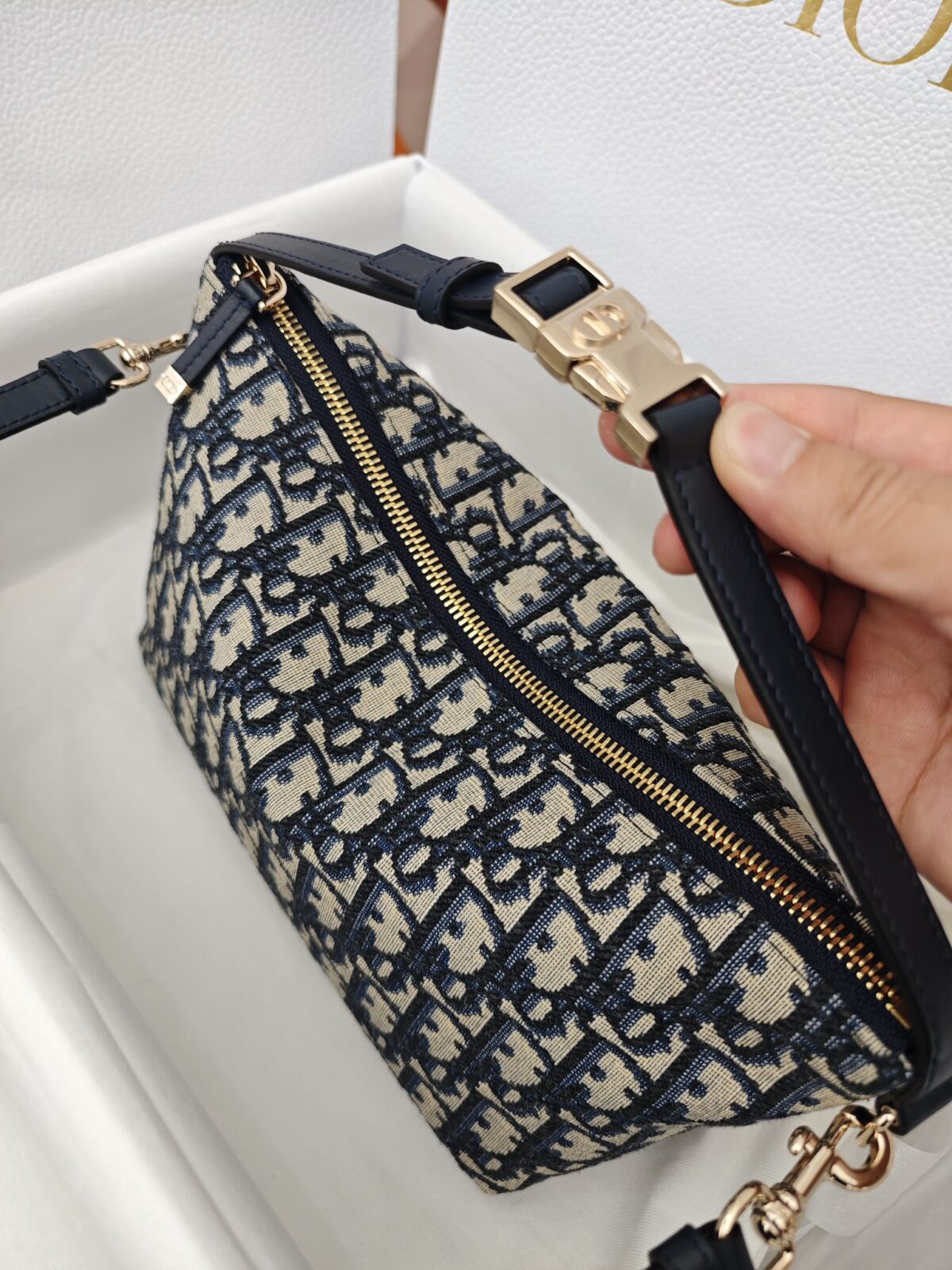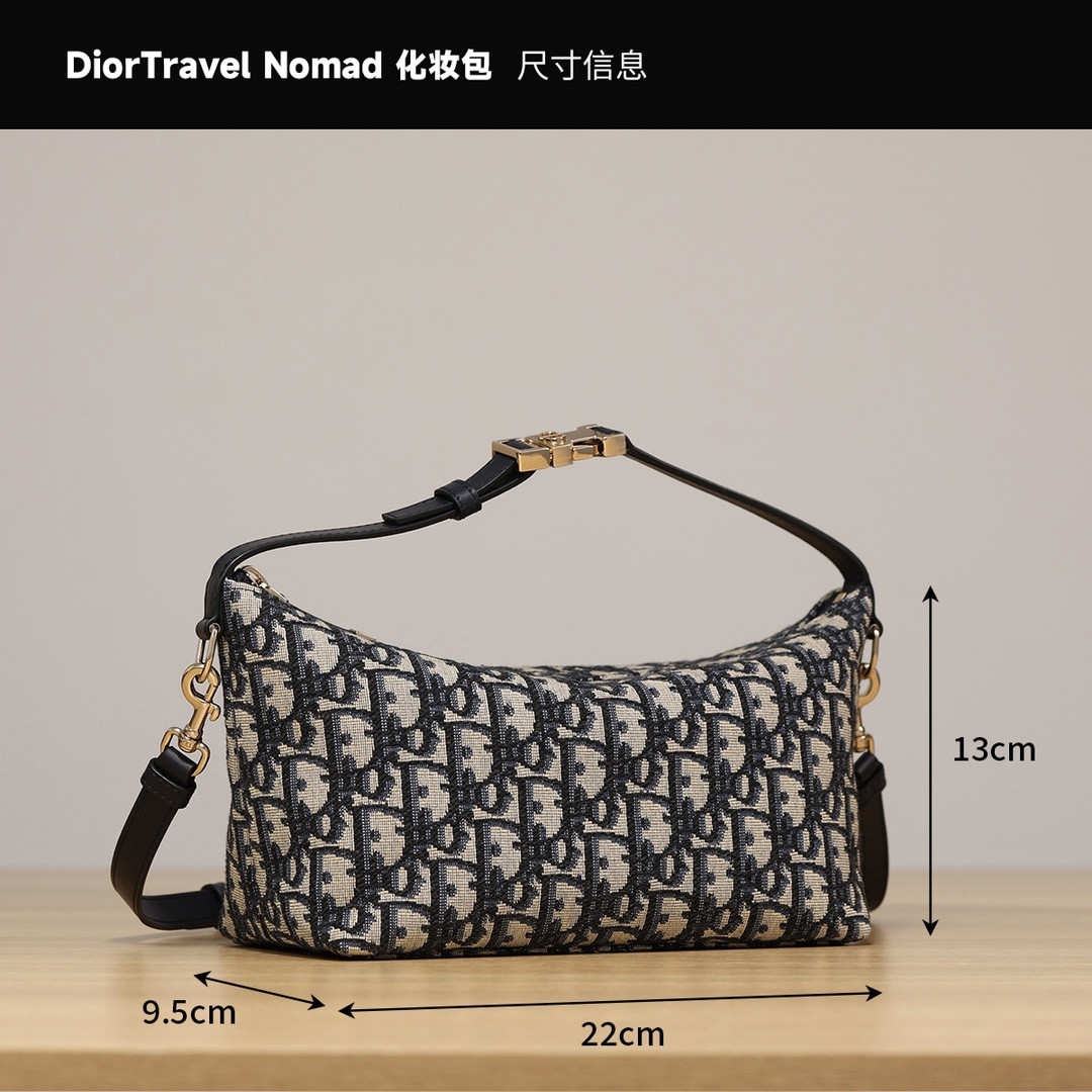 这款 DiorTravel Nomad 中号手拿包采用经典的 蓝色 Oblique 印花 技术面料制作,色泽沉稳且富有层次感。包身尺寸为 22 x 13 x 9.5 厘米(长 x 高 x 宽),整体造型圆润且极具空间感。材质方面,包身选用了进口原厂级刺绣面料,手柄及细节处配以原厂皮饰边。五金件采用复古金色金属,最具标志性的是可调节的顶部手柄,点缀以军装风格的 CD 扣。包袋开合方式为顶部拉链,侧面设有金属环,可根据需要另行搭配品牌刺绣肩带或细肩带。