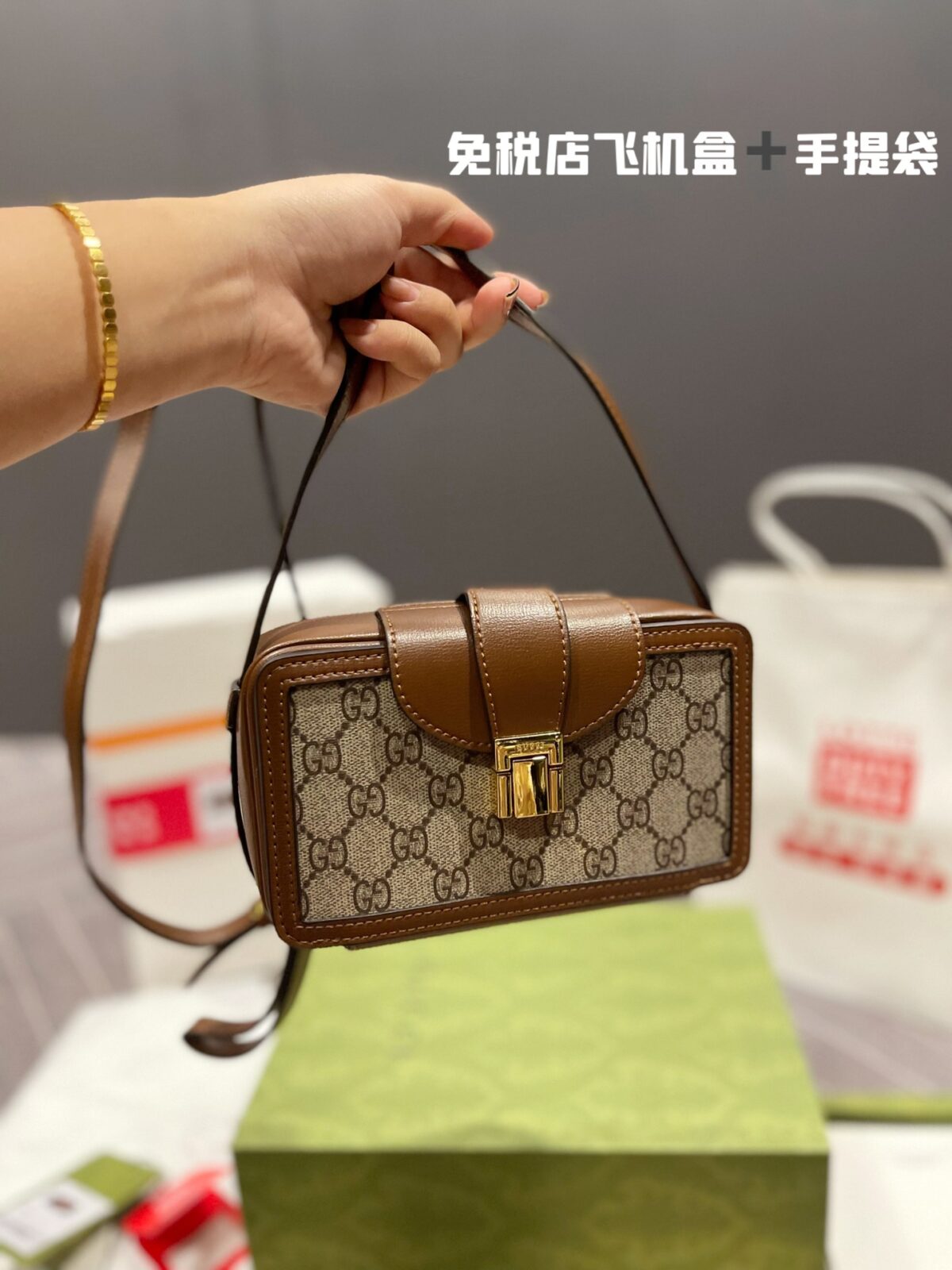 从选材上来说,这款包真正做到了“表里如一”。包身主体采用了经典的 GG Supreme 帆布,这种材质不仅耐磨防水,更承载了古驰百年的品牌印记。而包边的处理则选用了顶级的“原单牛皮”,皮质细腻且具有自然的油脂光泽,摸上去温润而不生涩。最令人惊叹的是它的结构设计,为了保持盒子包挺括的廓形,皮料与帆布的贴合需要极高的工艺水平,每一处转角、每一道缝线都体现了对细节的近乎偏执的追求。
