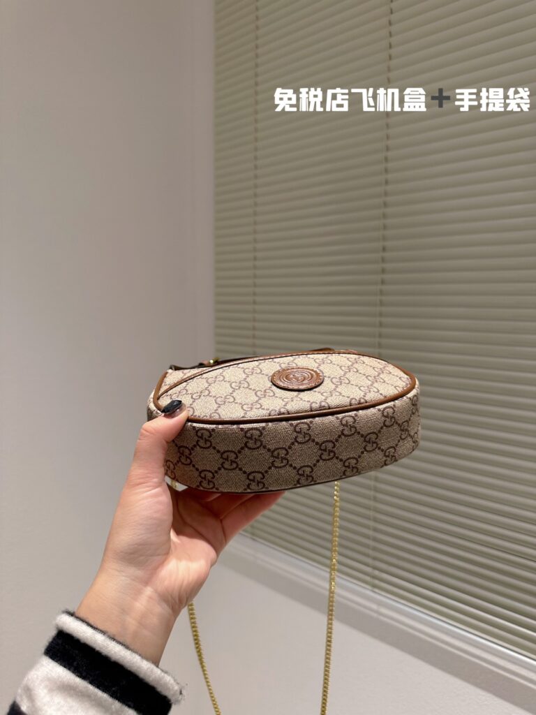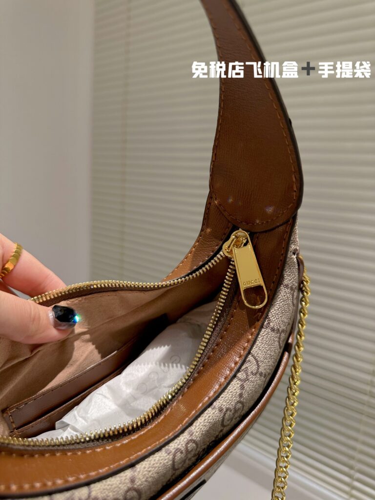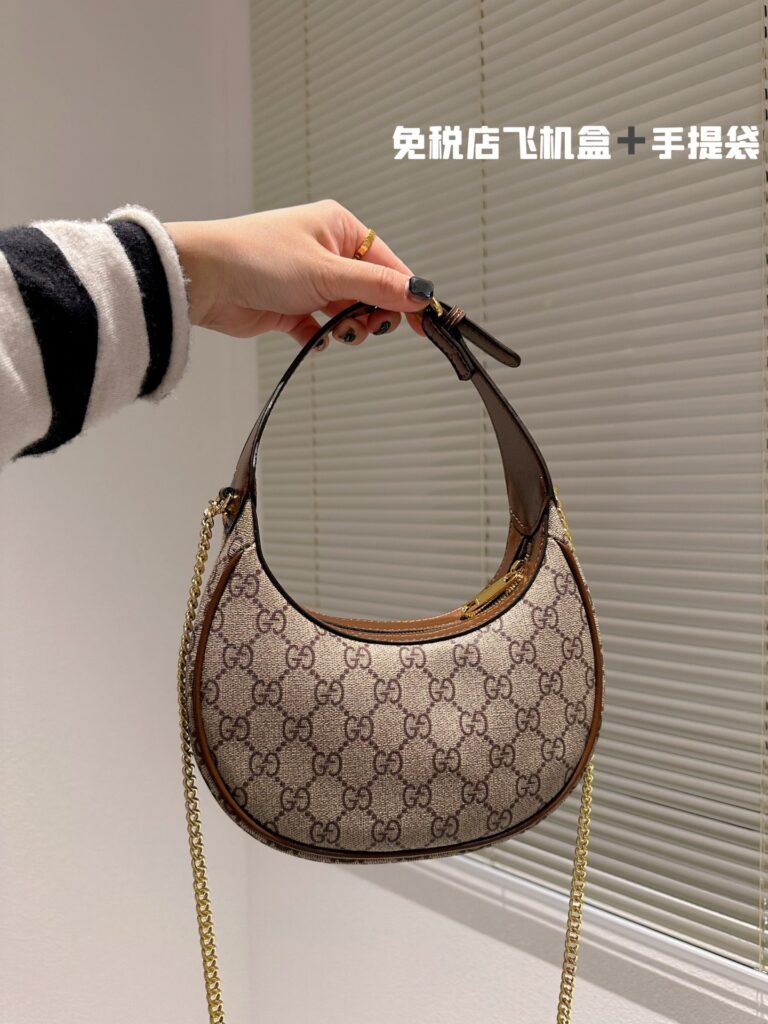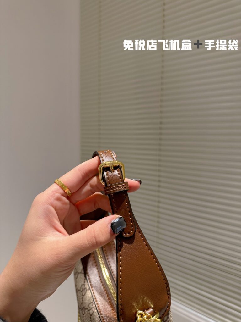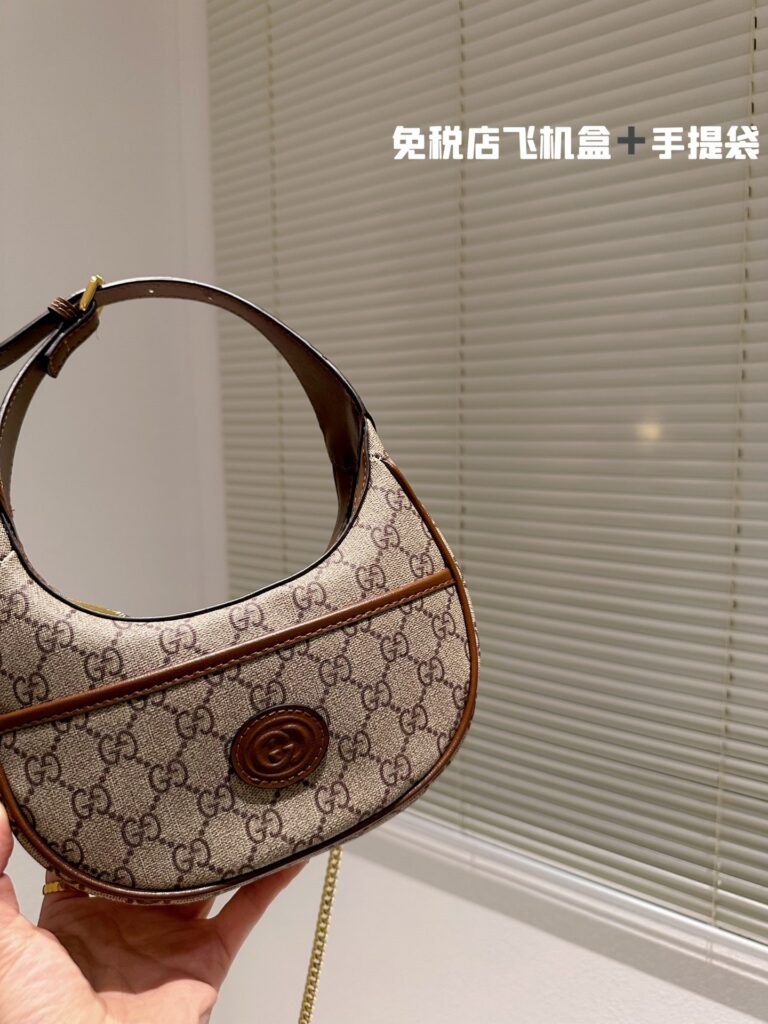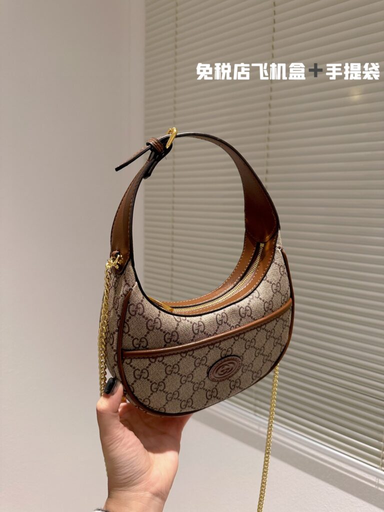 包袋参数速览 品牌:Gucci古驰;款式设计:Ophidia系列新款迷你月牙包/半月腋下包;核心配色:经典乌木色与米色老花交织,搭配复古棕色皮质包边;材质甄选:顶级定制级GG Supreme高级人造帆布,搭配进口头层牛皮饰边与复古做旧高品质合金五金;肩带配置:配备可调节棕色皮革手提带与一条可拆卸的复古奢华金色链条肩带;独家包装:发货即赠顶配免税店级别专属防压飞机盒与精美品牌手提袋。整体尺寸精巧绝伦,专为亚洲女性量身定制,完美契合当下小废包与实用主义并存的潮流趋势。