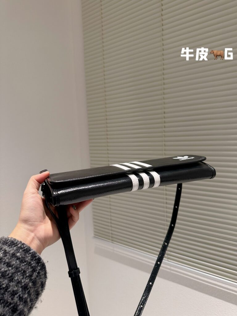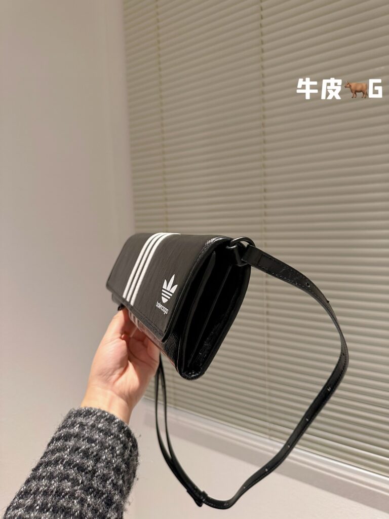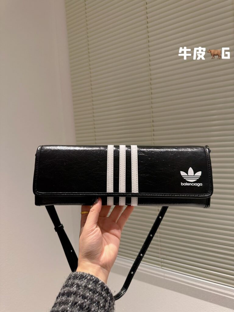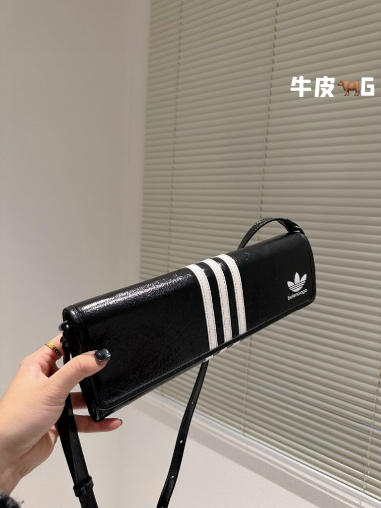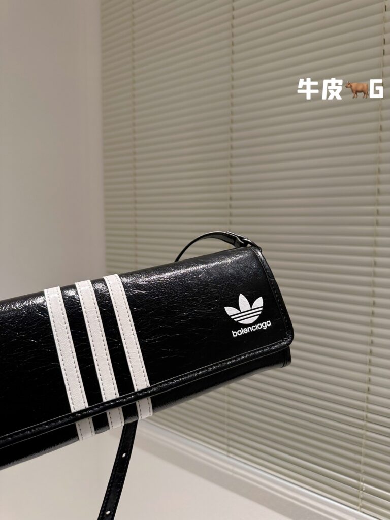 产品基本参数: 这款备受瞩目的联名款包袋采用经典纯黑色调,辅以阿迪达斯标志性的白色三条纹设计。尺寸规格为 33 x 12 cm,呈现出优雅的长方形线条。材质方面,精选上乘头层牛皮(Top Grain Leather),手感细腻且富有自然光泽。包身正面点缀有 Balenciaga 字体与 Adidas 三叶草联名 Logo,配备可调节的长肩带,既可单肩腋下背负,亦可手提,完美适配多种穿搭场景。