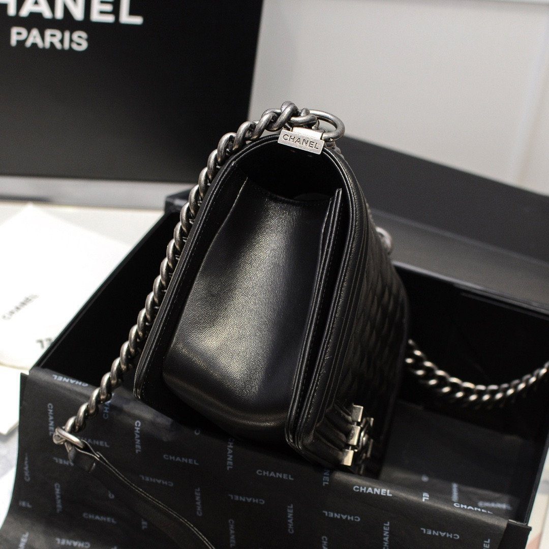拥抱 Chanel Le Boy 系列那前卫而精致的魅力吧!这款包型巧妙地融合了摇滚精神与永恒的巴黎奢华格调。该系列提供两种截然不同的材质风格选择,均饰有标志性的“钌色”(银黑色)金属配件;这种独特的工艺赋予了粗犷的链条与双C按扣一种令人惊艳的复古工业光泽,与深邃的黑色皮革形成了完美的映衬。