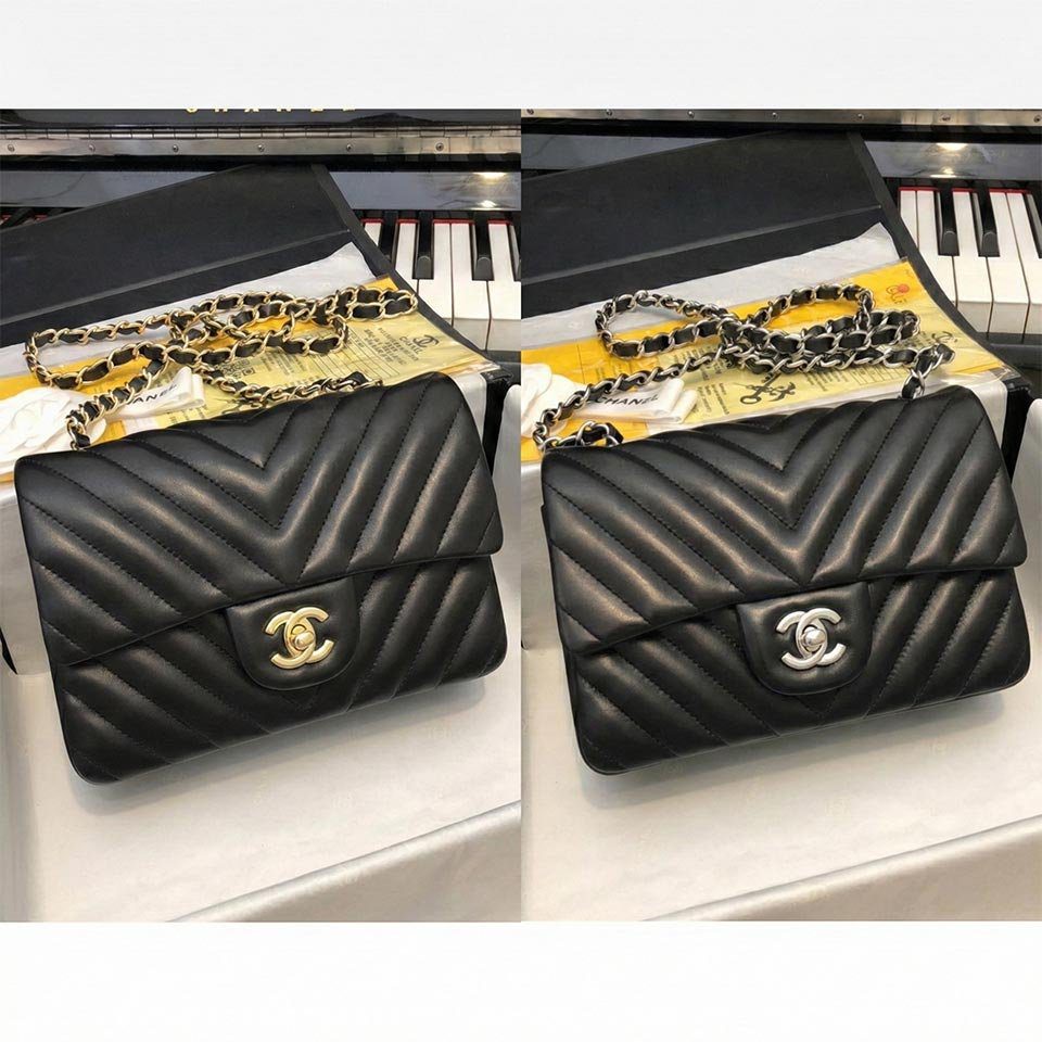 璀璨五金:配有闪耀夺目的双C旋扣锁,并搭配经典的金属链条与皮革交织而成的肩带。所有五金配件均经过极致抛光打磨,提供金色和银色两种色调可选(详见参考图片所示)。