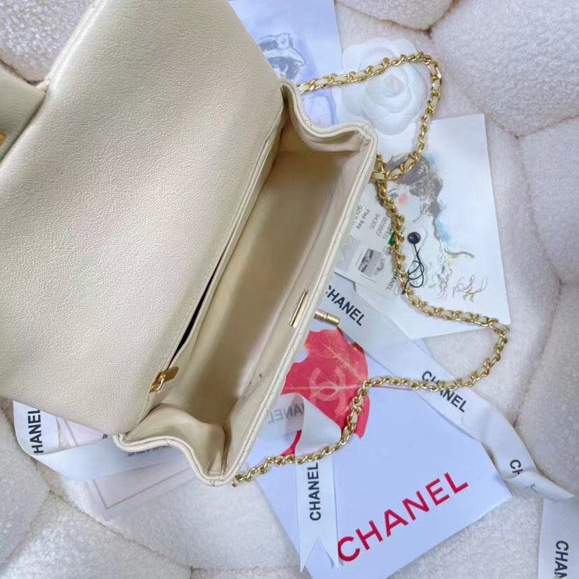 金色五金:点缀以璀璨的金色五金配件,包括经典的 CC 旋扣锁与精致的链条肩带,为杏色皮革增添了一抹温暖而奢华的光泽。