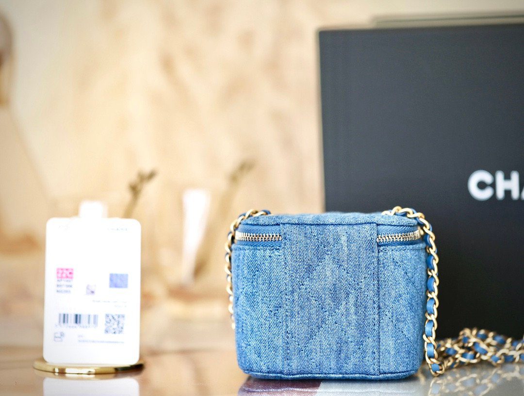 这款迷人的 Chanel 化妆箱包是 2022 早春(22C)系列中的一款杰出单品。它采用蓝色绗缝丹宁面料精心打造,在经典的包型轮廓中注入了一抹既休闲又不失奢华的独特风情。包身正面饰有标志性的金色 CC 标志,并配有顶部拉链开合设计。一条交织着蓝色皮革的金色链条肩带,赋予了这款包袋灵活多变的佩戴方式,既可单肩背,亦可斜挎。其小巧方正的盒状造型,不仅完美契合日常携带随身物品的需求,更流露着 Chanel 品牌独有的优雅格调。