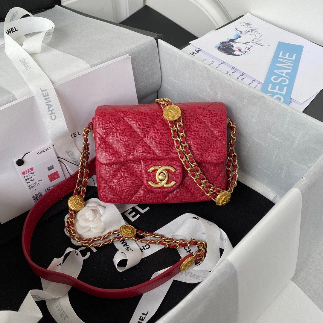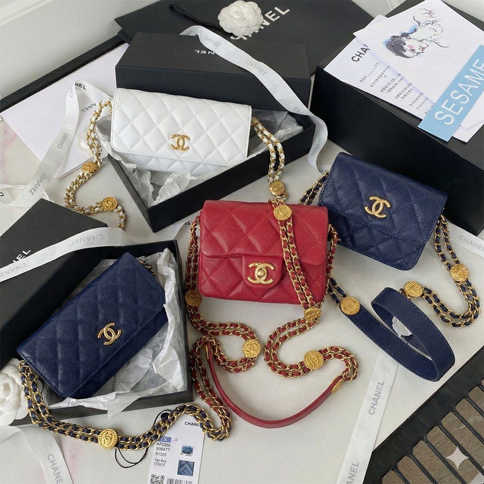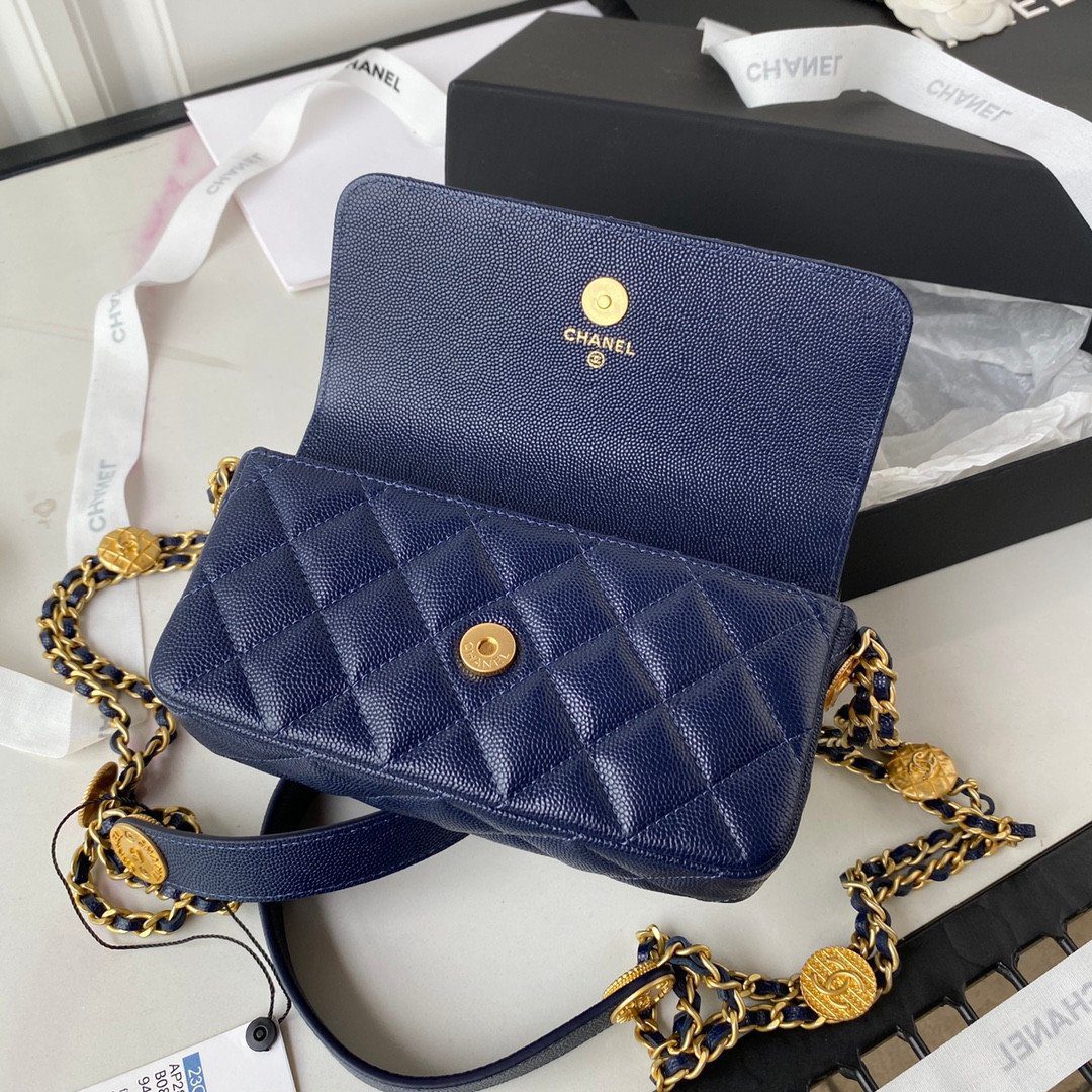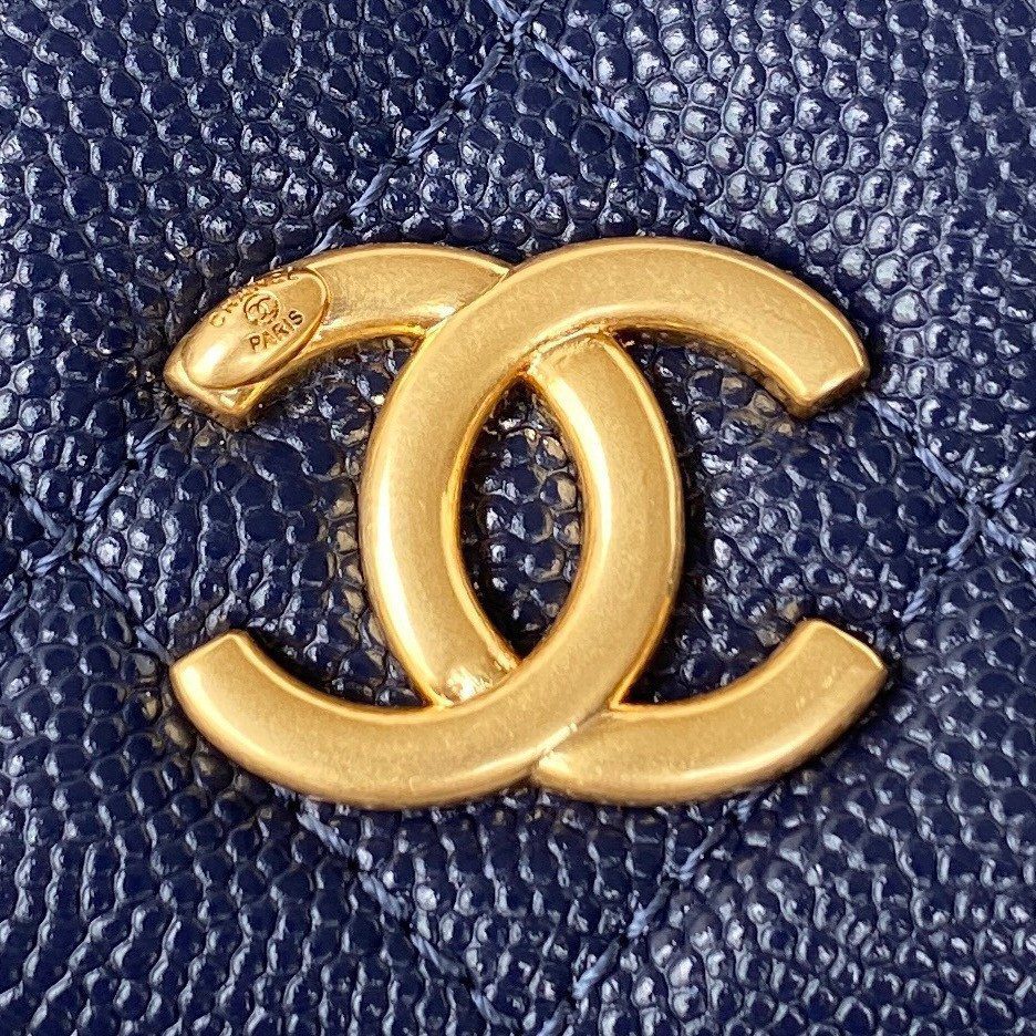 独特五金:配有别具一格的皮穿链肩带,点缀着醒目的 Chanel 圆形Logo徽章,并设有舒适的皮质护肩。