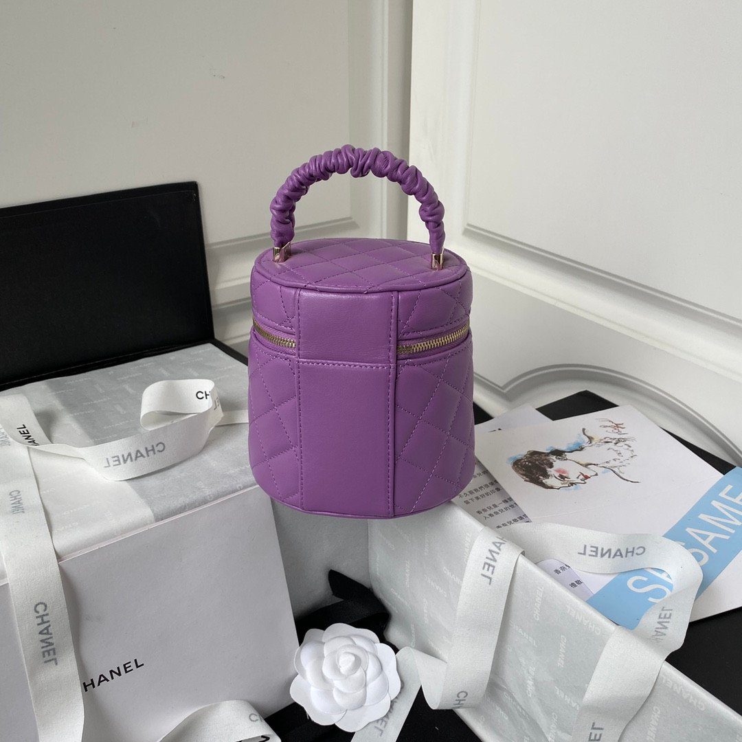 这款精美的香奈儿 (CHANEL) 圆柱形化妆包,为您的收藏增添一抹俏皮又不失精致的气息。它采用顶级牛皮精制而成,保证全新无瑕疵。引人注目的设计包括独特的褶皱皮革提手、经典的菱格纹绗缝以及正面醒目的双C标志。安全拉链开合,搭配镌刻品牌标志的金属拉链头,确保您的必备物品得到妥善保护。这款迷人的配饰有粉色和紫色等多种亮丽色彩可供选择,并配有专属礼盒。