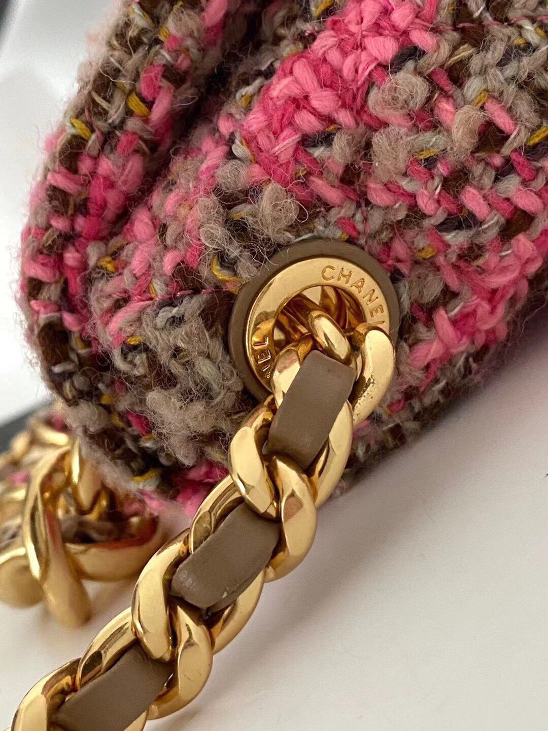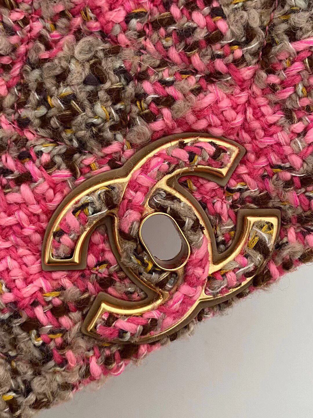 精致五金细节:标志性的双C标识和粗链条顶部饰以精巧的斜纹软呢,尽显卓越工艺。
