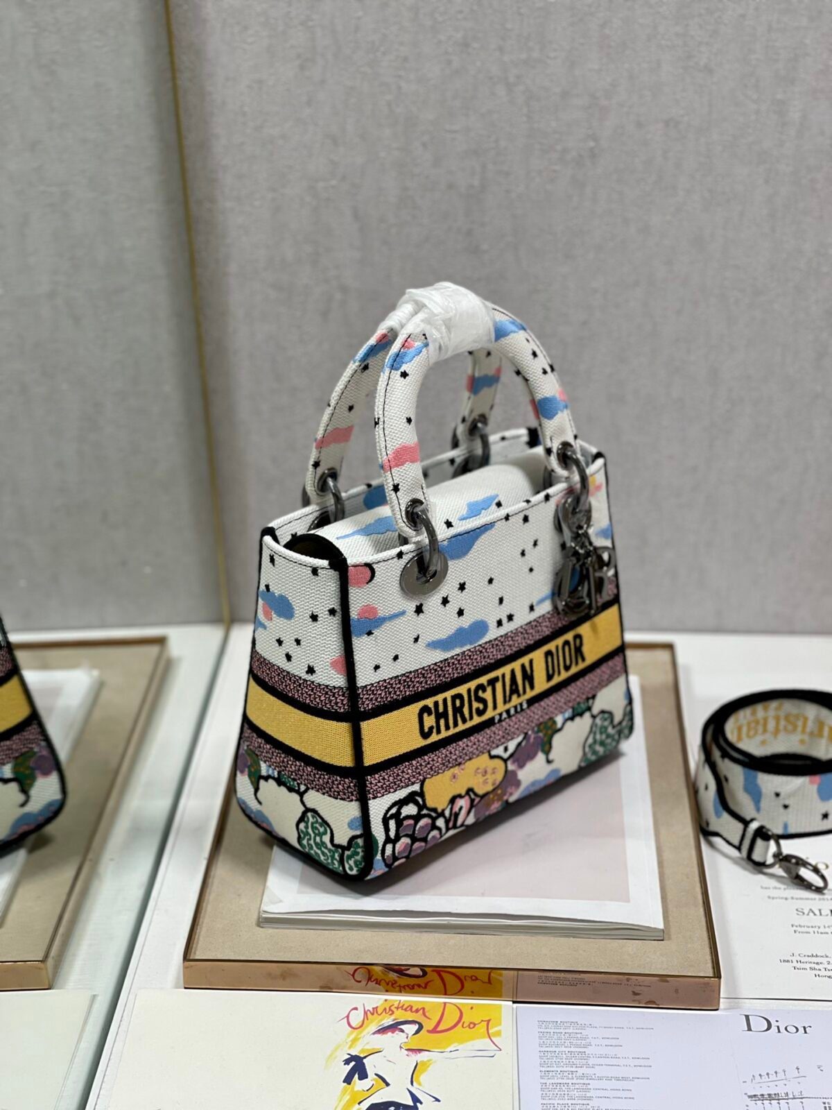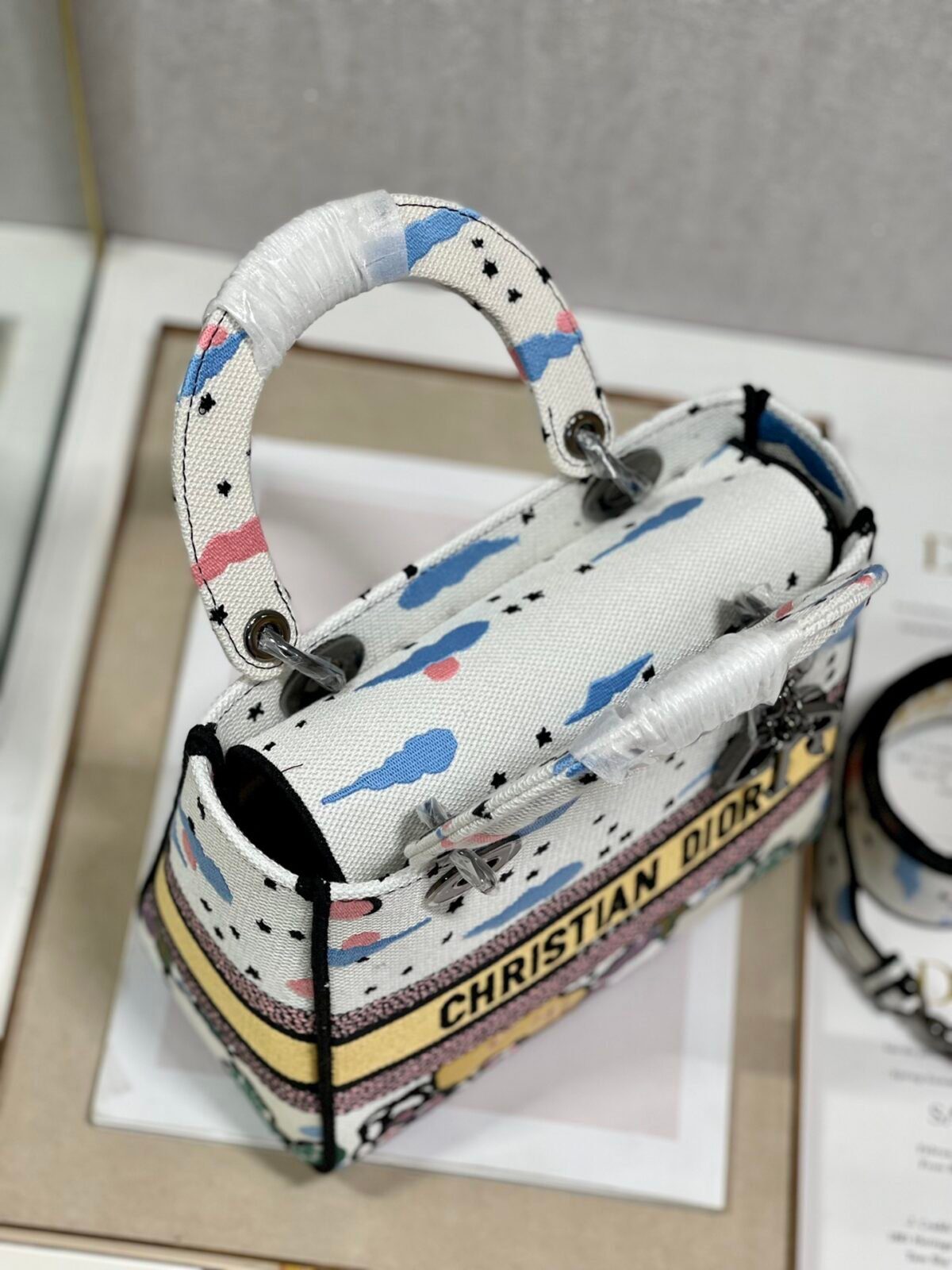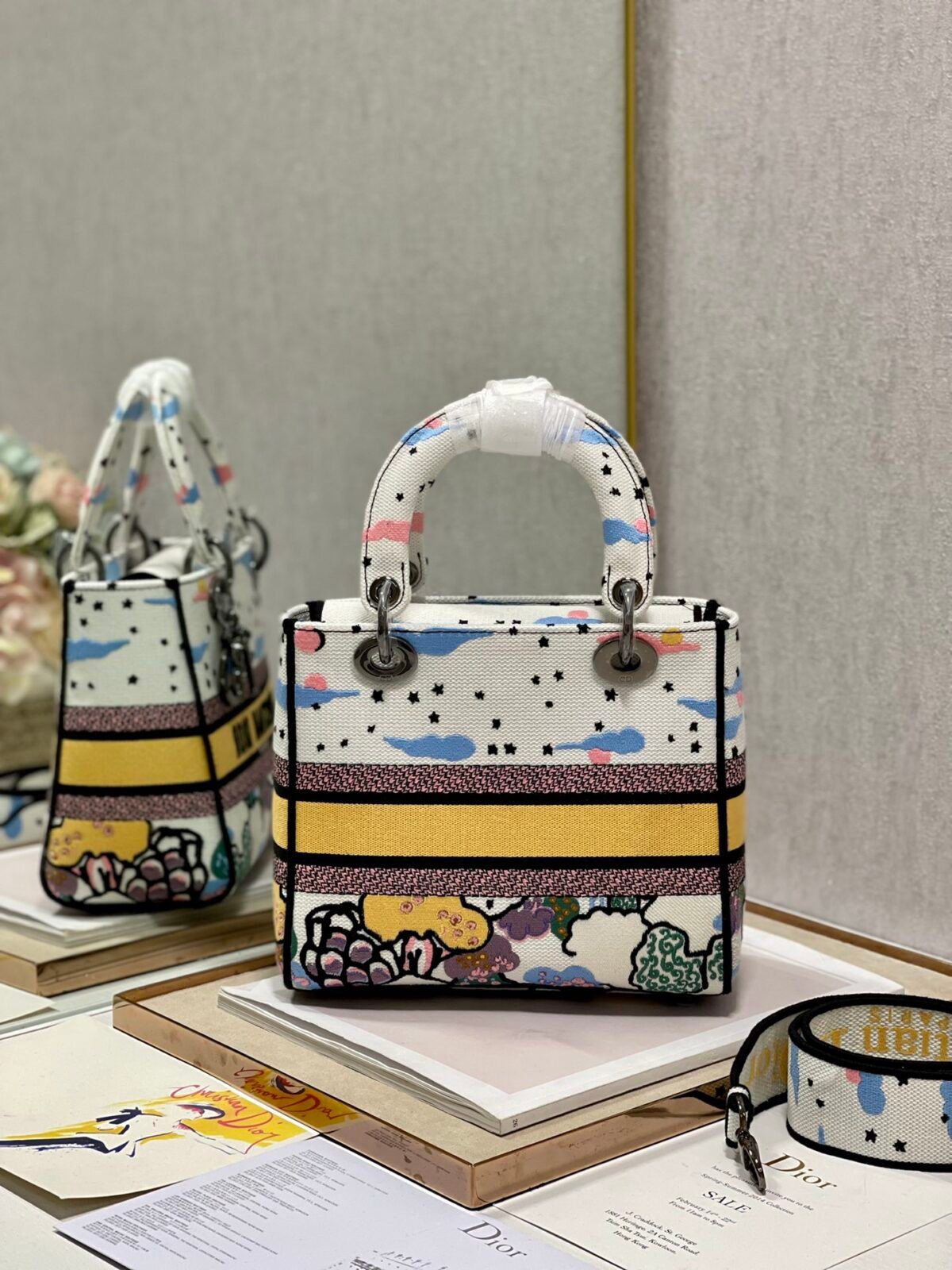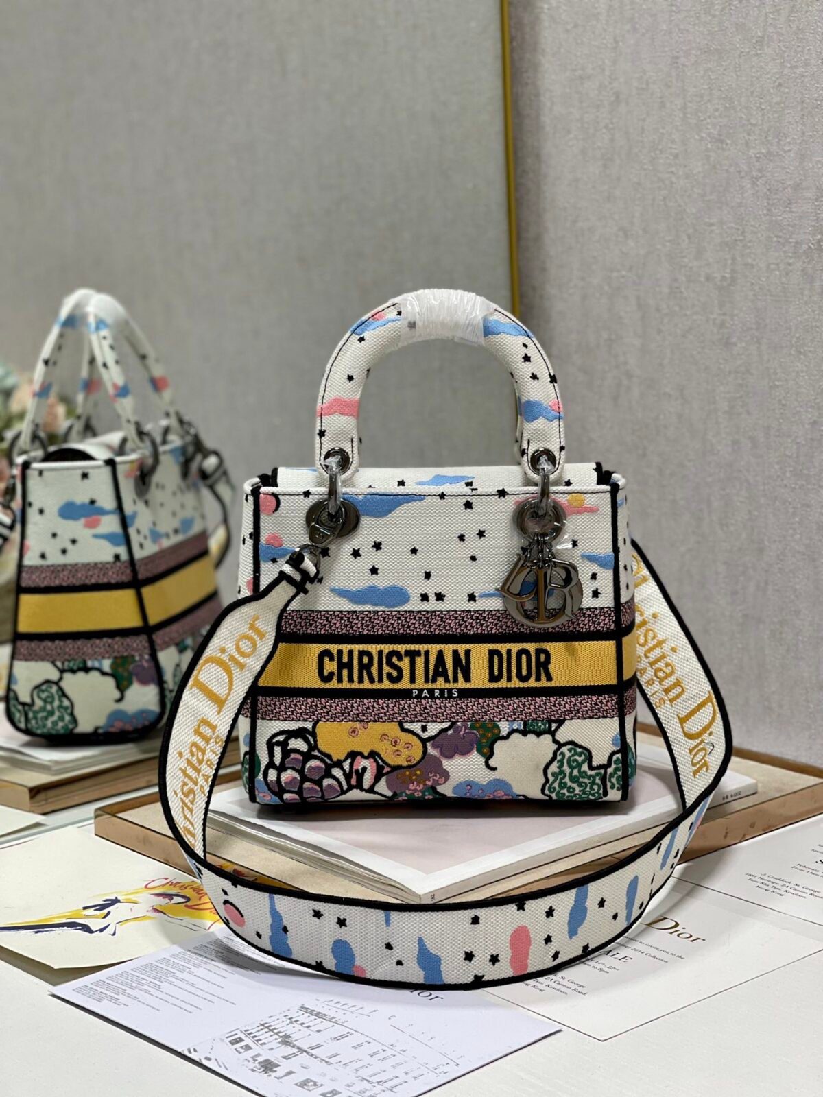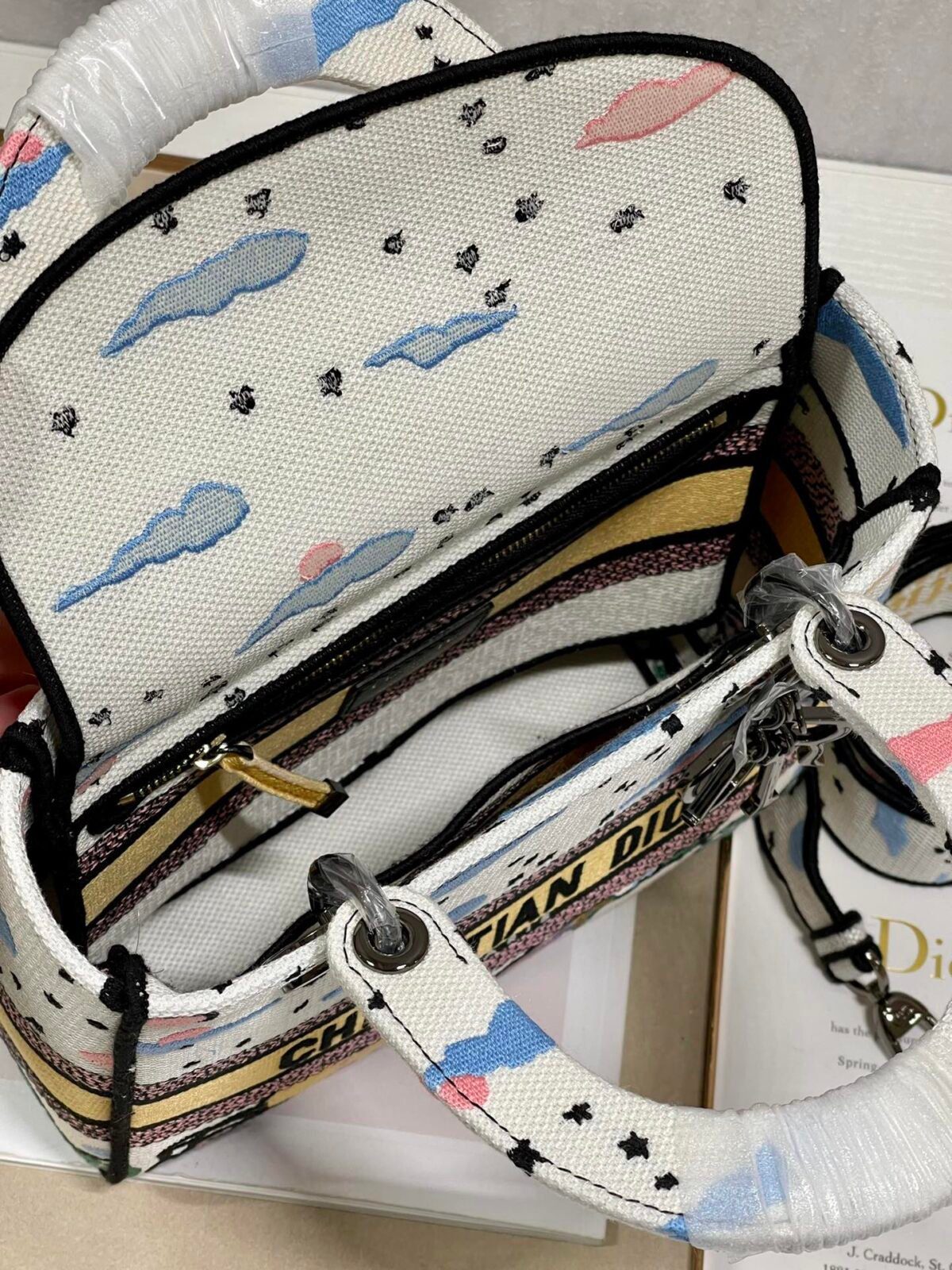 The Lady D-Lite Bag combines classic elegance with the modernity of the House’s fully embroidered collections. This specific edition features the enchanting “Dreamy Starry Sky” motif, a whimsical design filled with clouds, stars, and vibrant colors that evoke a poetic and romantic atmosphere.