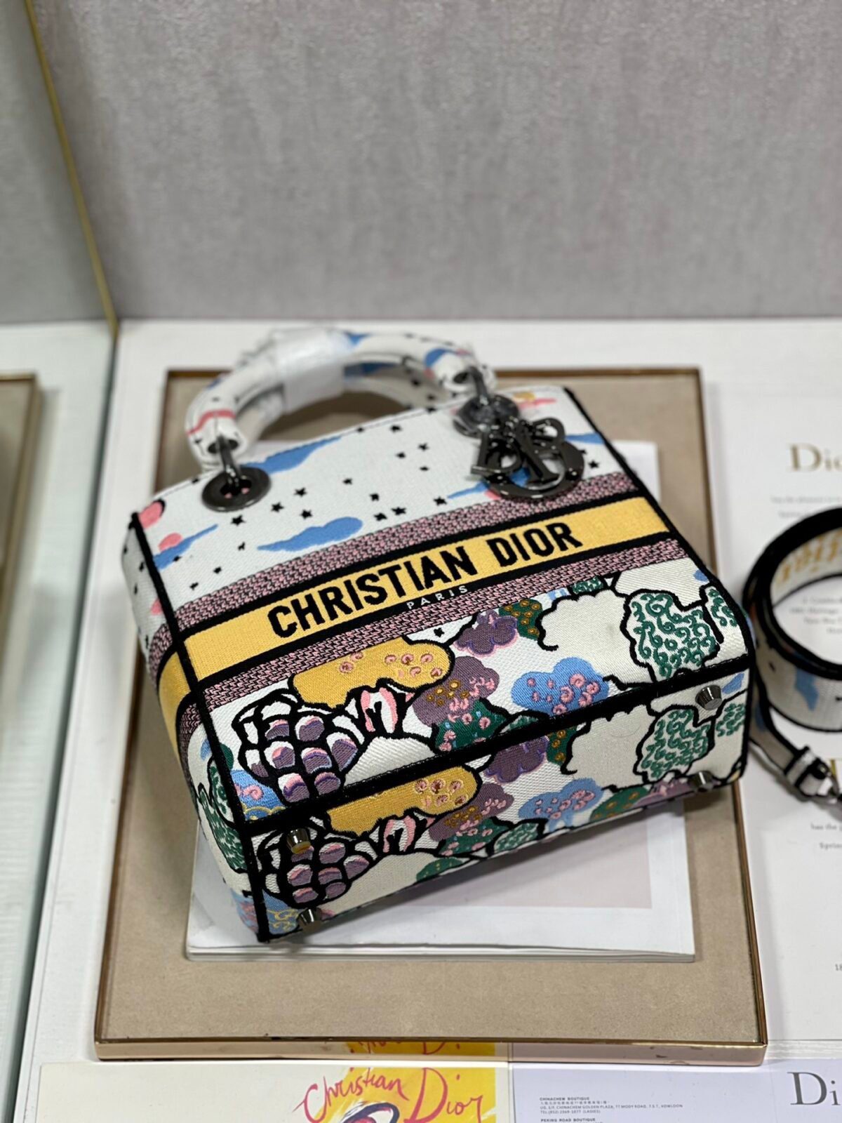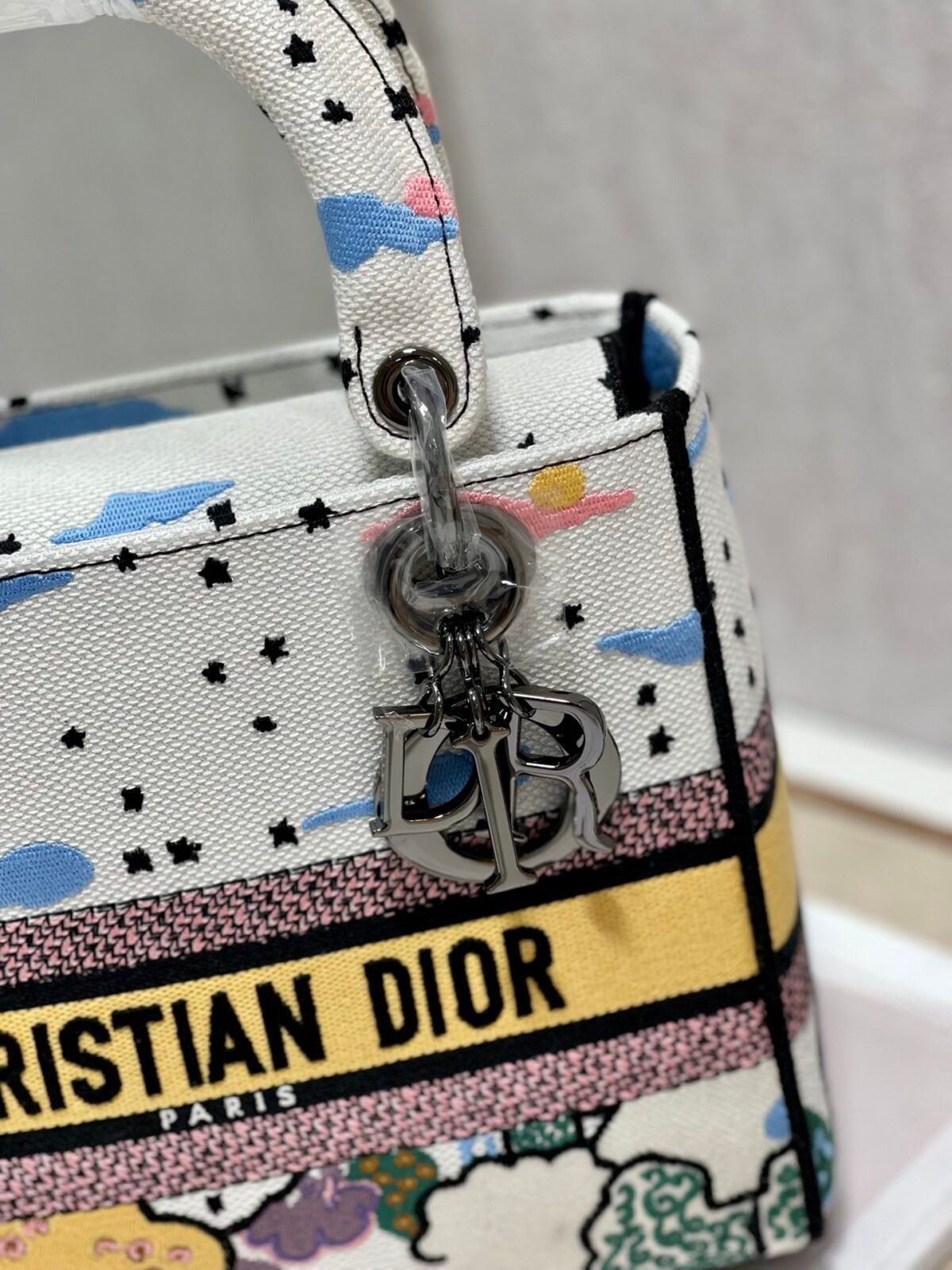 The bag is fully embroidered with the multi-colored sky pattern, creating a rich, textured surface. The front is adorned with the “CHRISTIAN DIOR PARIS” signature band, while the “D.I.O.R.” charms in a sleek dark metal finish add a touch of movement and modern sophistication to the silhouette.