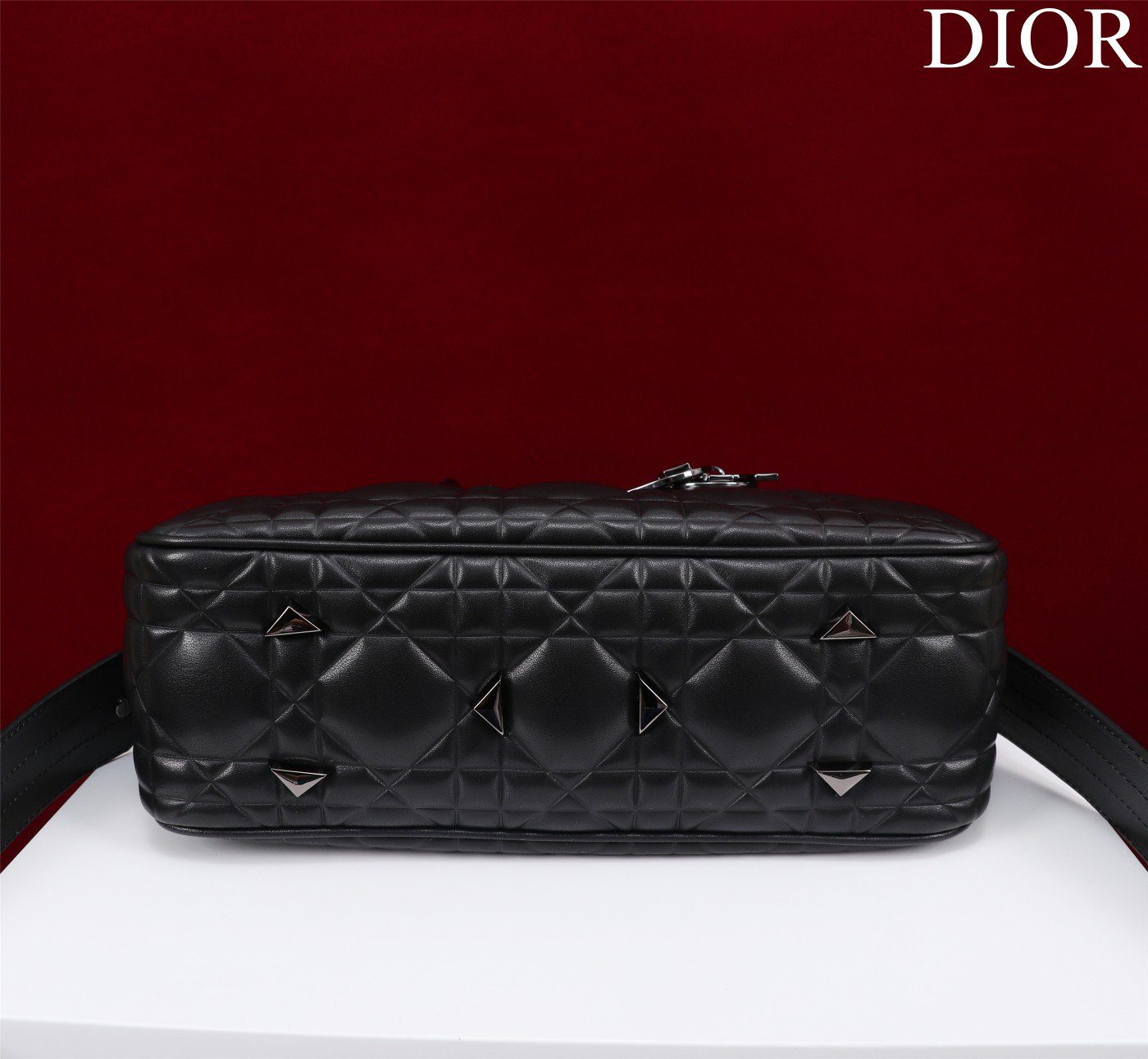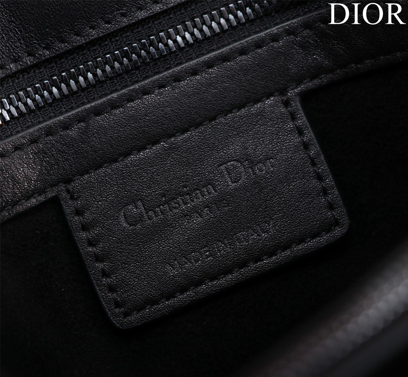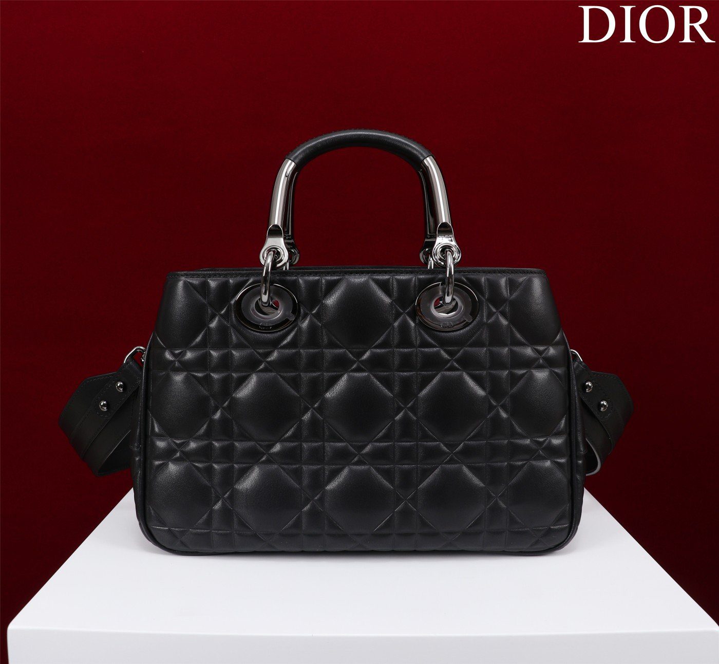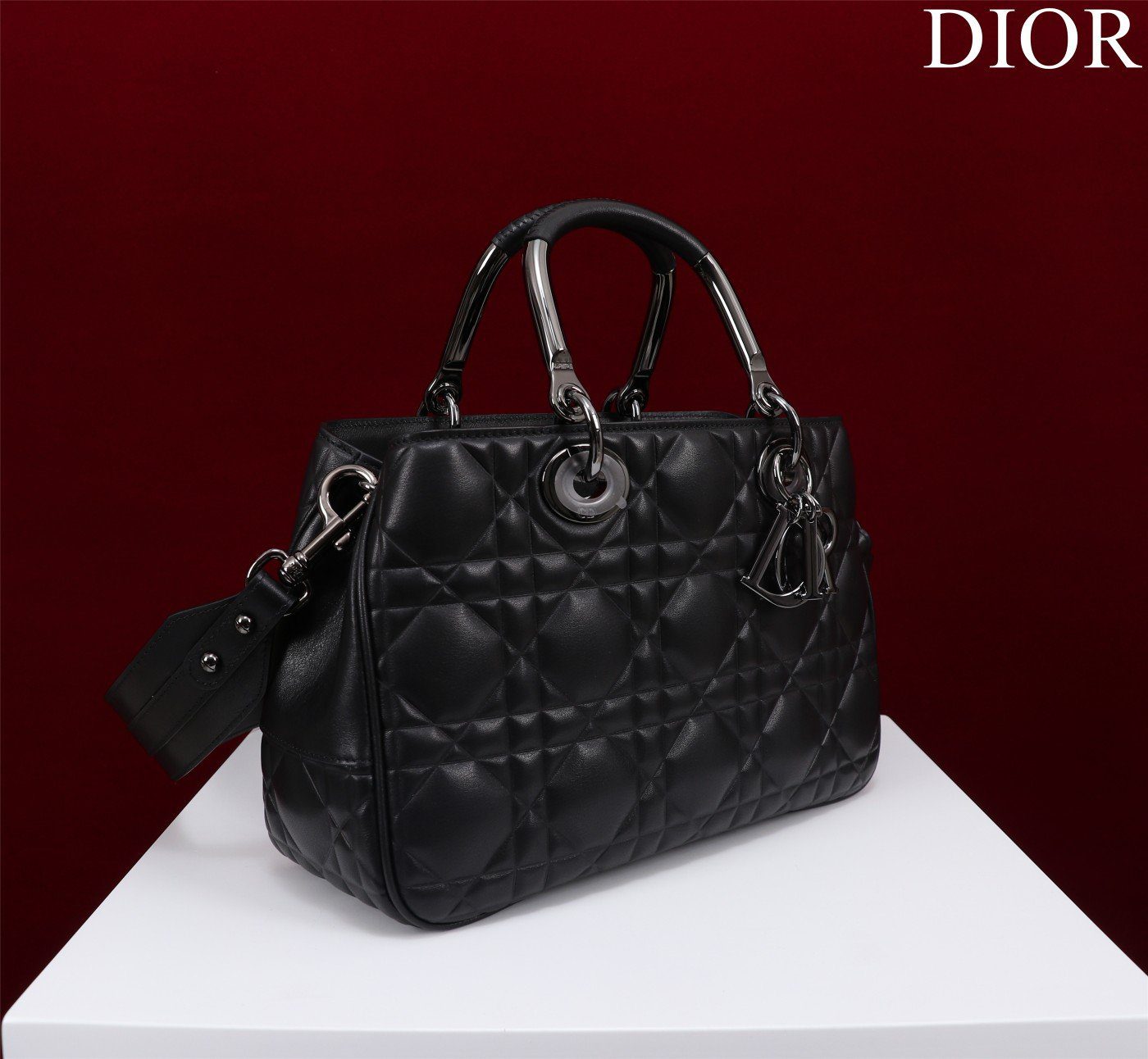 手袋配有独特的金属与皮革拼接提手,巧妙融合了金属配件的坚固质感与皮革握柄的舒适触感。包身点缀着标志性的“D.I.O.R.”字母吊坠,提供金色饰面与深钌色饰面(深银色)两种选择,为手袋增添了一抹精致考究的奢华格调。