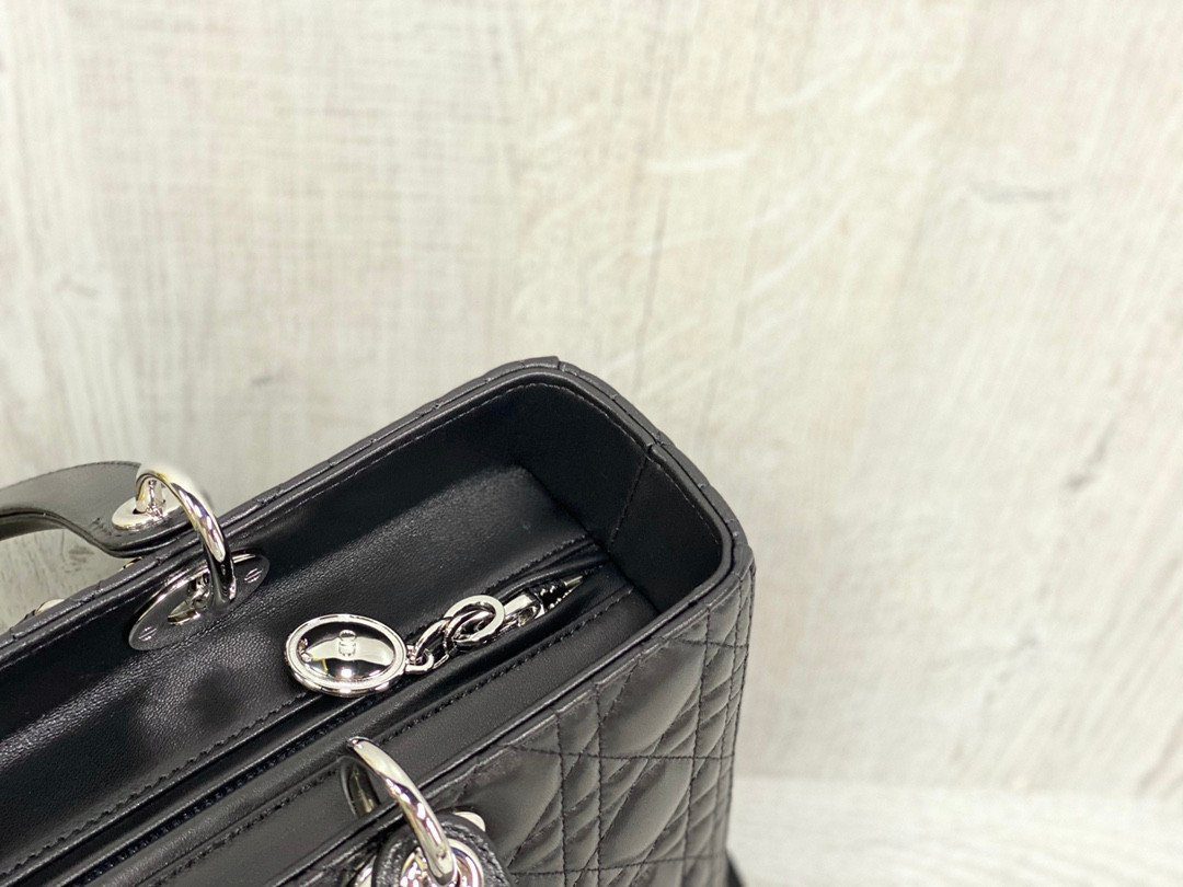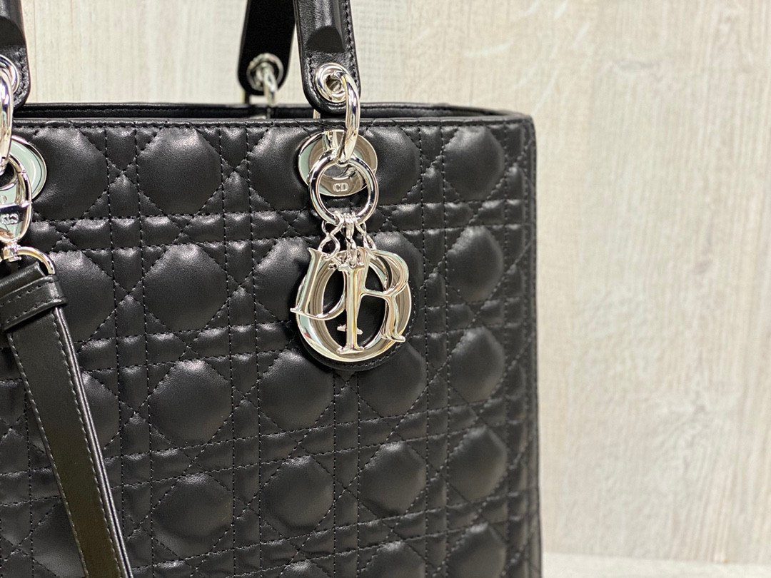 这款手袋选用奢华的黑色小羊皮精心打造,饰有标志性的“藤格纹”(Cannage)缝线,呈现出那种令人一眼即识的绗缝纹理,正是这种纹理定义了 Lady Dior 独特的审美风格。光滑的黑色皮革与银色饰面金属配件相得益彰,在经典的手袋轮廓之上,营造出一种既现代又酷飒的对比美感。