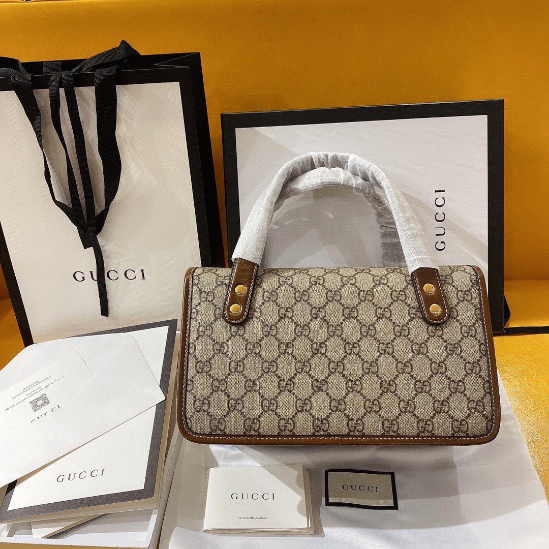 这款结构优雅的手袋采用“原厂”级材质精心打造,饰有品牌历史悠久的 GG 字母交织图案帆布。经典的品牌标识(Monogram)由优质的棕色皮革细节精美勾勒,包括卷边顶部手柄、包身滚边以及正面醒目的中央皮革饰片。