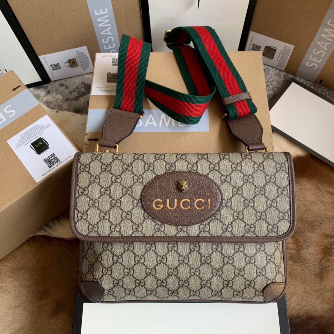 这款包袋选用品牌经典的 GG Supreme 帆布(PVC材质)精心打造,并辅以色泽浓郁的棕色牛皮饰边,整体外观优雅迷人。包身正面的翻盖上饰有一枚标志性的椭圆形皮革标签,其上镶嵌着醒目的金属猫科动物头像装饰,并配以金色的“GUCCI”品牌标识。