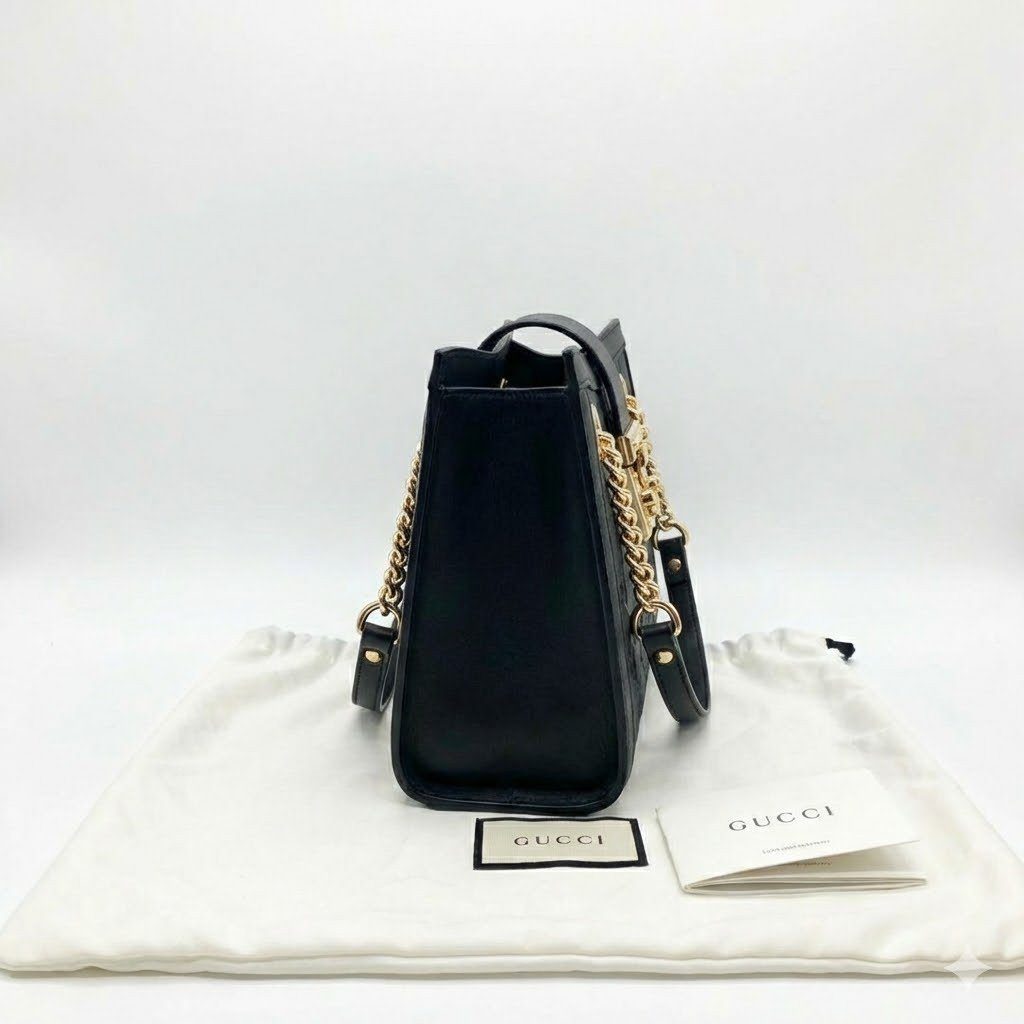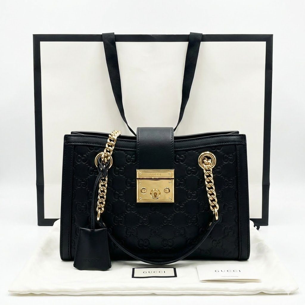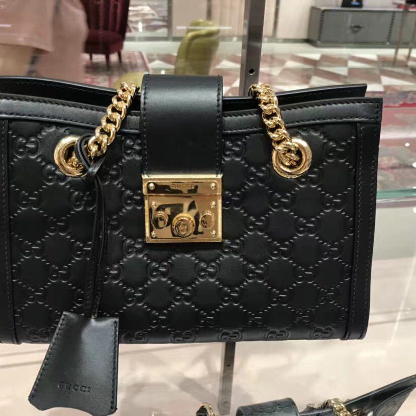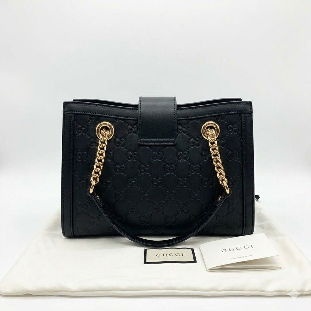 **标志性压纹皮革系列:** 一款极具精致感的单色版本,通体采用黑色 Gucci Signature 压纹皮革制成,表面饰有满铺的 GG 图案压纹。