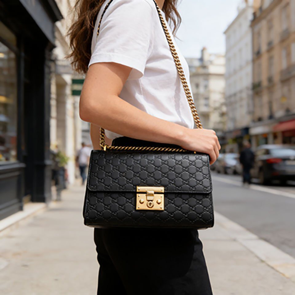 此款包袋由工匠精心打造,外观呈现浓郁的纯黑色调,选用优质的压印 Gucci Signature 皮革制成。这种独特的工艺在皮革表面形成了鲜明的通体 GG 图案,为设计增添了层次感、细腻的纹理以及奢华的触感。
