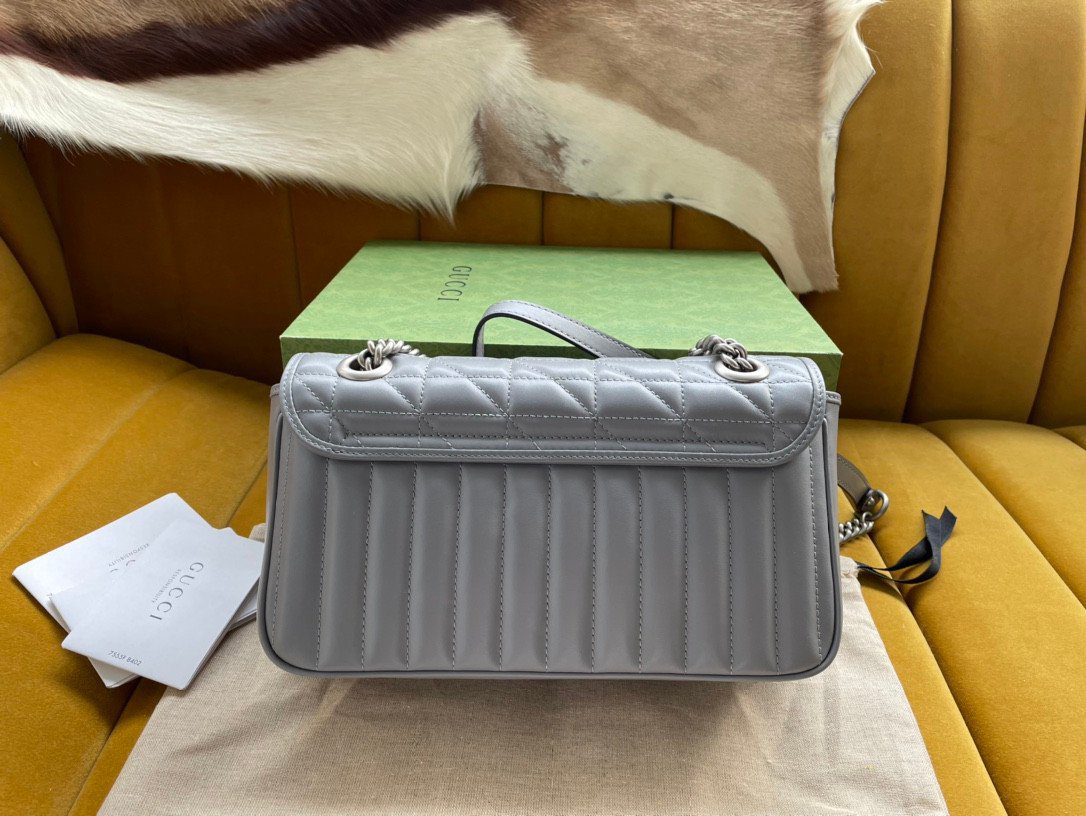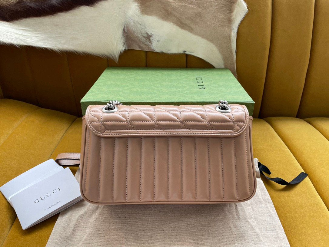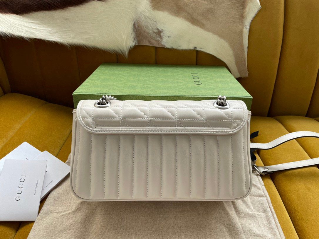 此款包袋严格遵循“原厂”级高标准精工细作,选用触感柔软细腻的优质皮革打造而成。作为 Aria 系列的特别版本,它为经典的 Marmont 风格注入了全新的几何美学:包身外部巧妙融合了垂直与斜向交织的绗缝缝线图案,呈现出别具一格的视觉效果。包盖正面饰有该系列的标志性“双 G”字母交织金属配件,采用光泽流畅的现代感银色饰面,与焕然一新的绗缝工艺相得益彰。