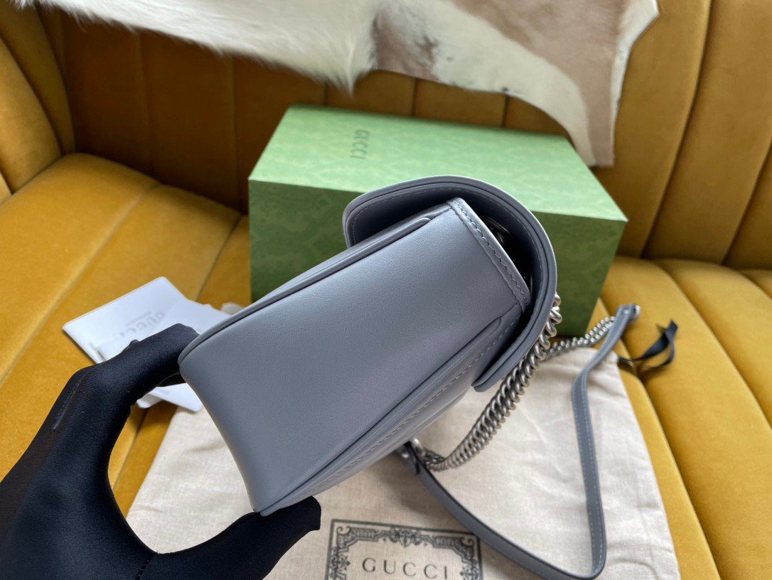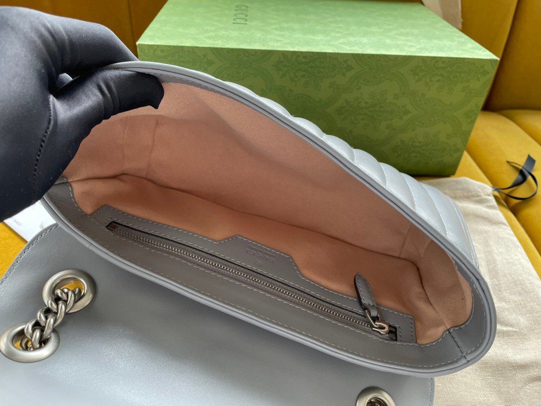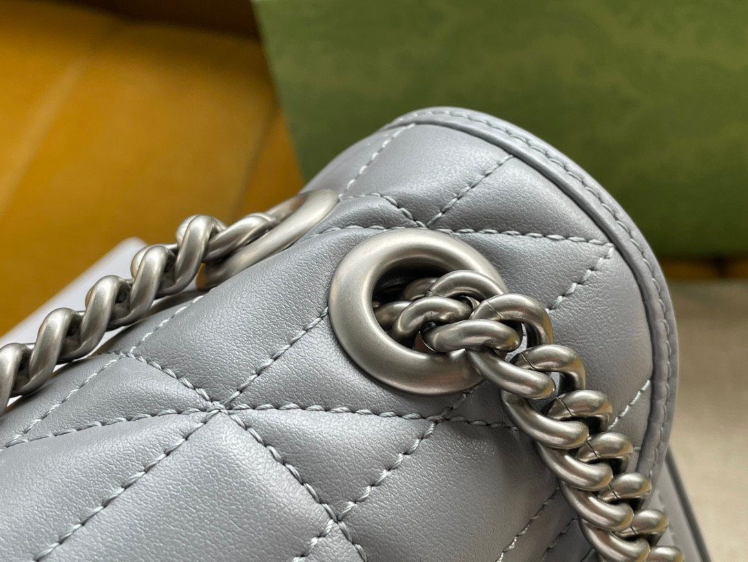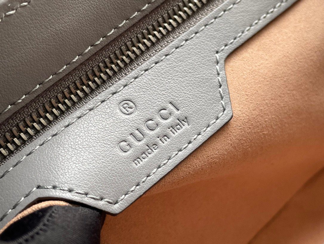 五金配件:标志性的“双 G”字母交织徽标,呈现光泽流畅的银色饰面。