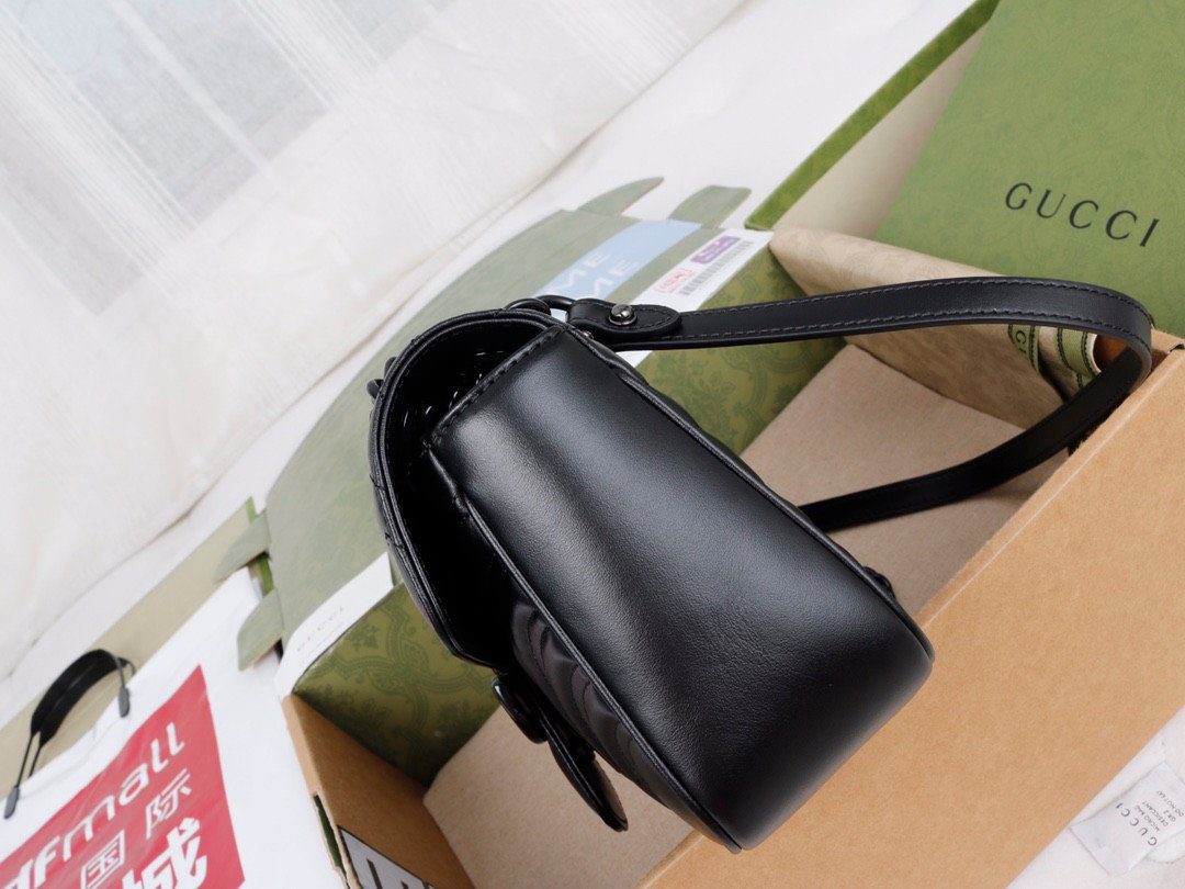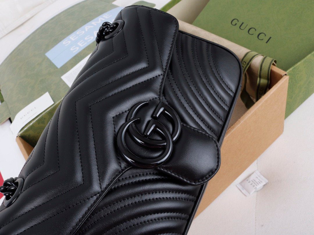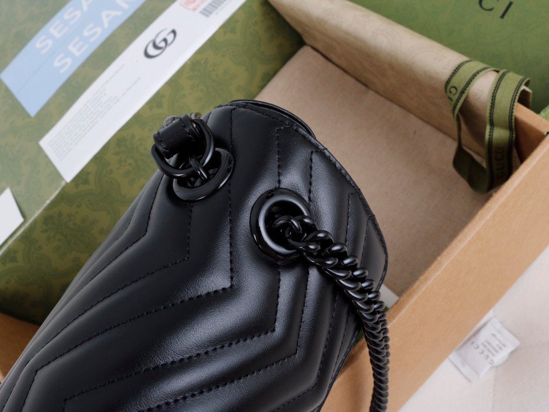这款包袋严格遵循“原厂”级标准精工细作,选用进口精品级牛皮材质,带来极致奢华的触感体验。包身外侧饰有该系列标志性的V形(人字纹)绗缝细节,工艺精湛。此款包袋最鲜明的特色在于其引人注目的同色系美学设计:标志性的双G(Double G)金属配件与配套的金属链条肩带均采用光泽感十足的黑色/深钌色饰面,共同营造出一种极具现代感与前卫个性的时尚氛围。