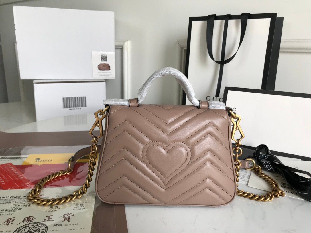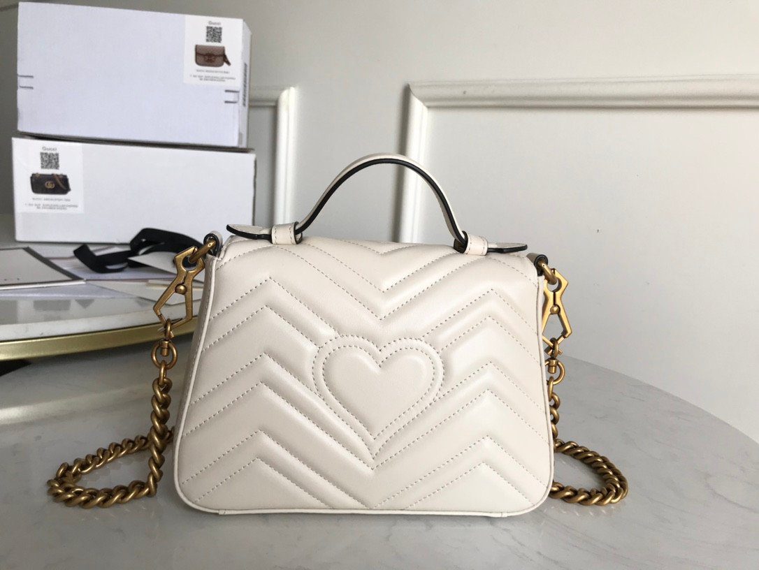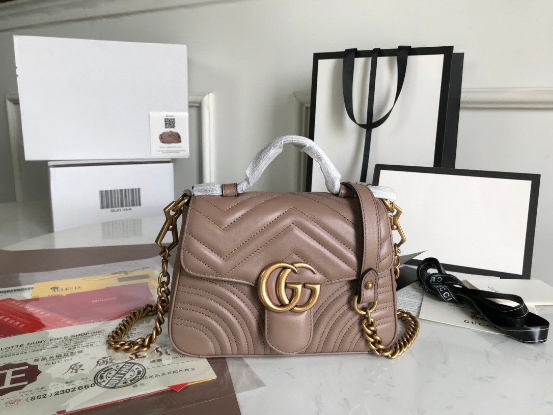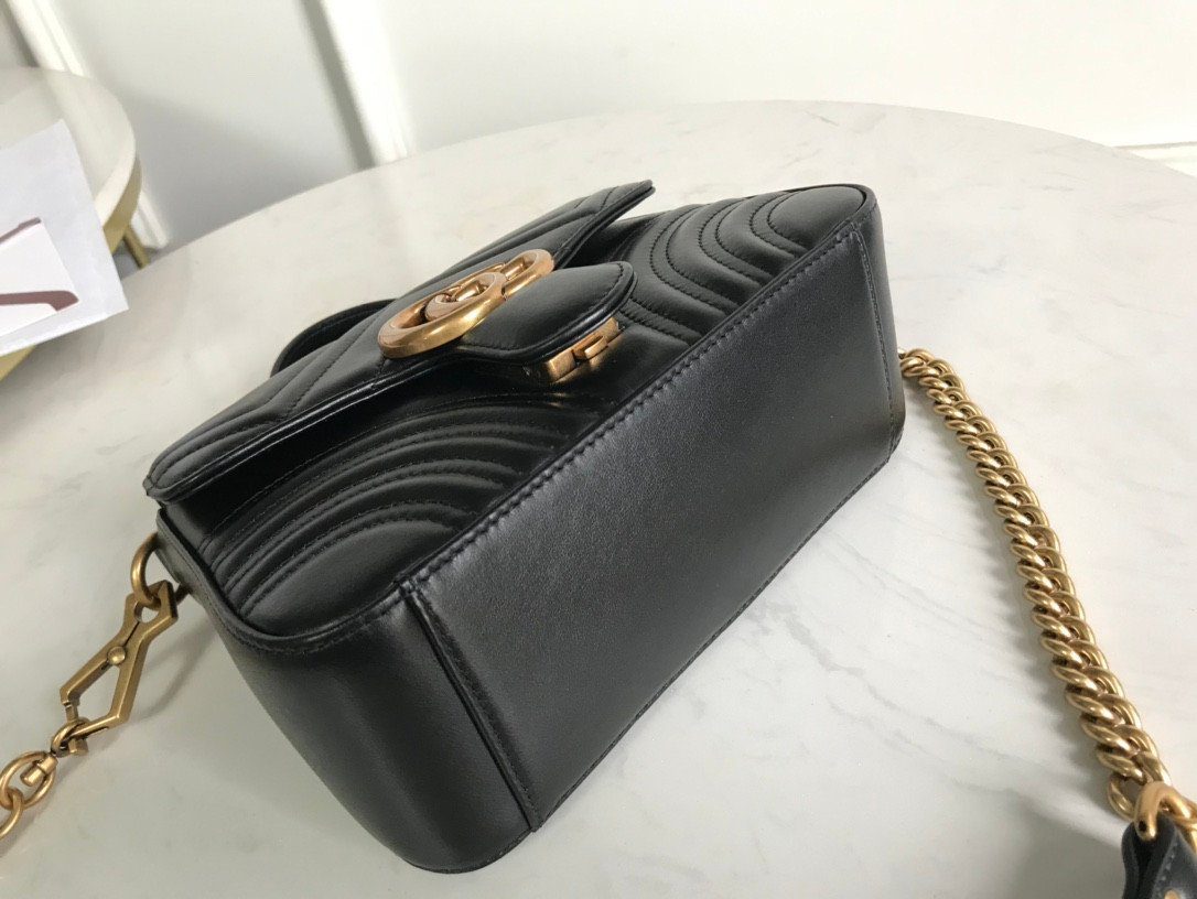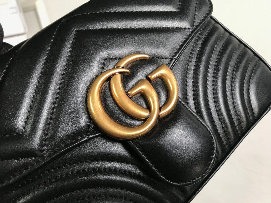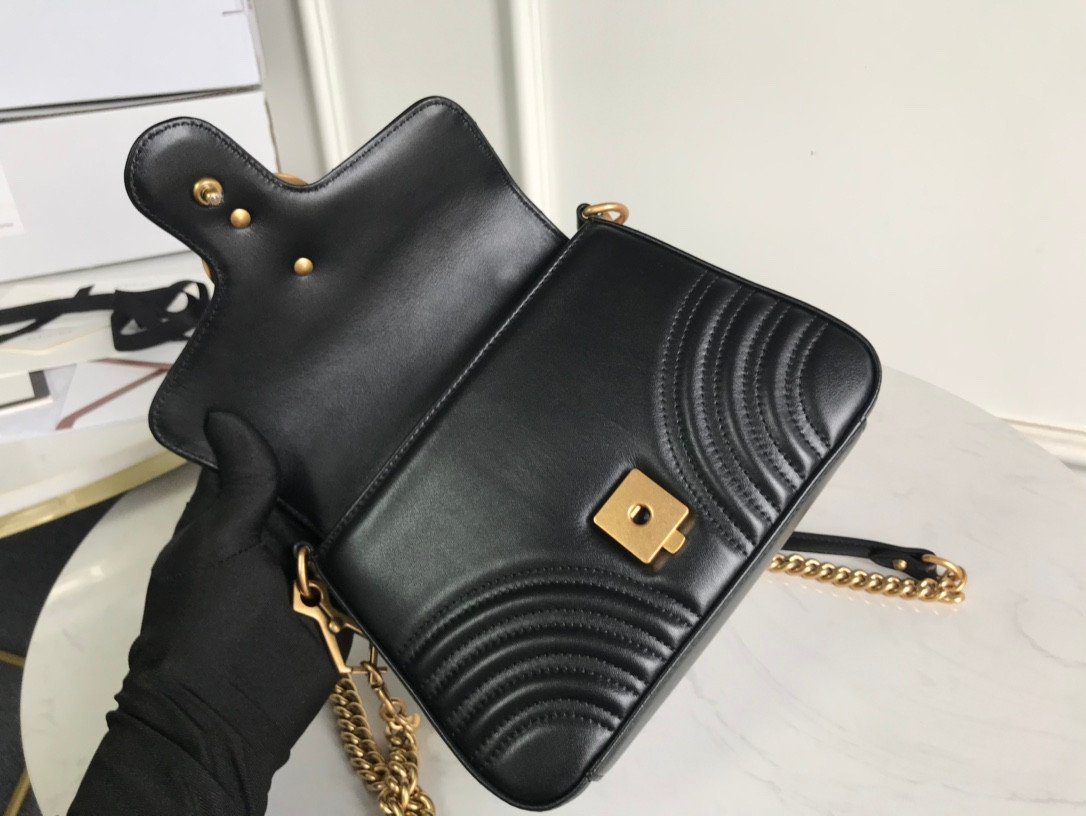 这款美包秉承严苛的制作标准,选用优质的意大利“原厂”皮革精制而成,带来极致奢华且触感真实的非凡体验。包身外部饰有该系列标志性的 V 形(Matelassé)绗缝细节,呈现出一种柔和而富有结构感的唯美外观。包盖正面的点睛之笔,则是那醒目且极具辨识度的做旧金色双 G(Double G)金属饰件。