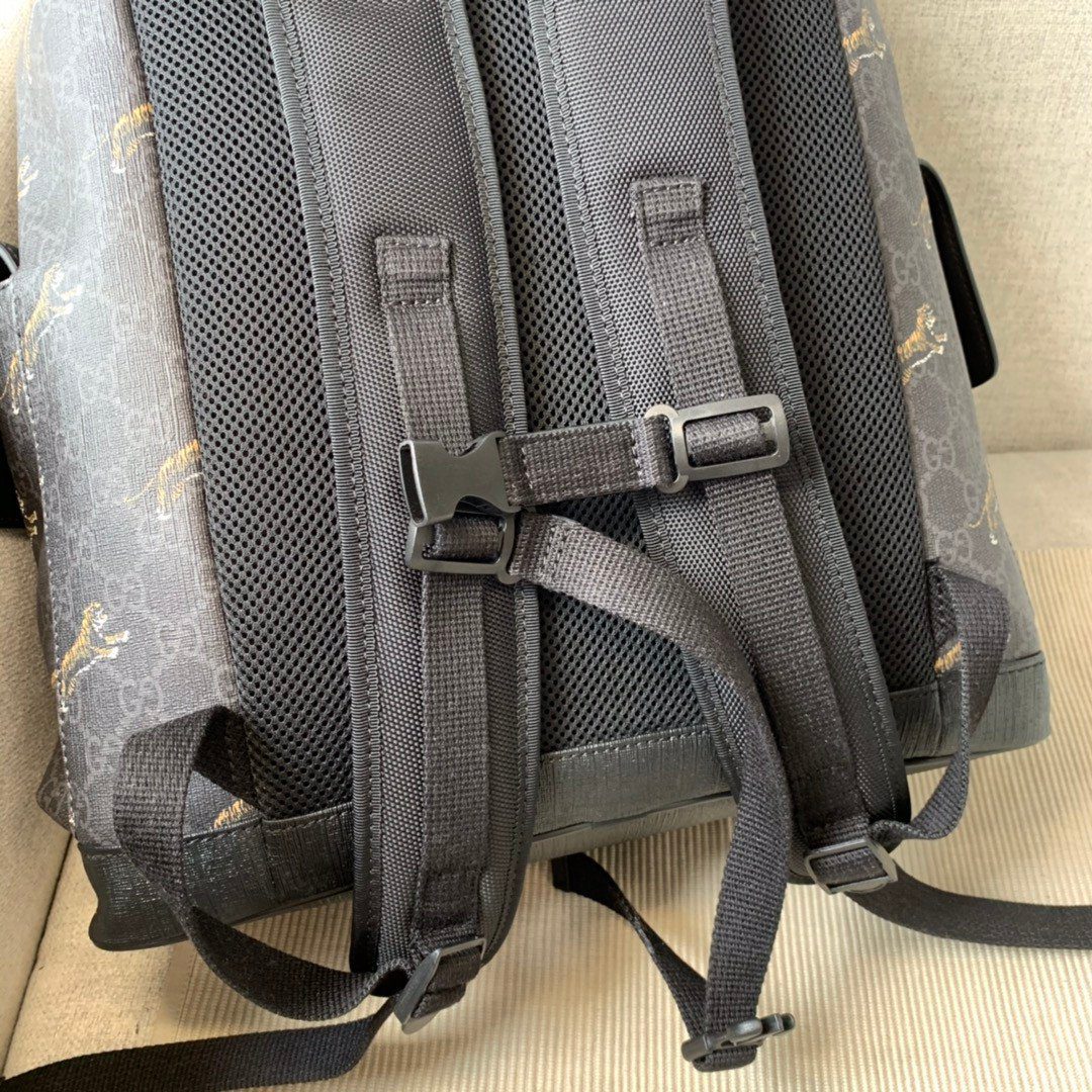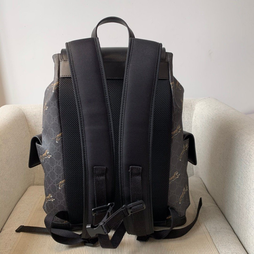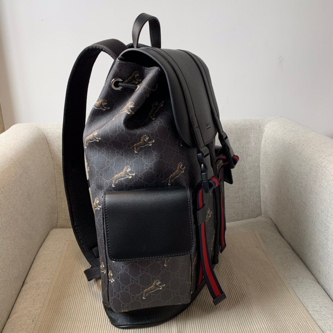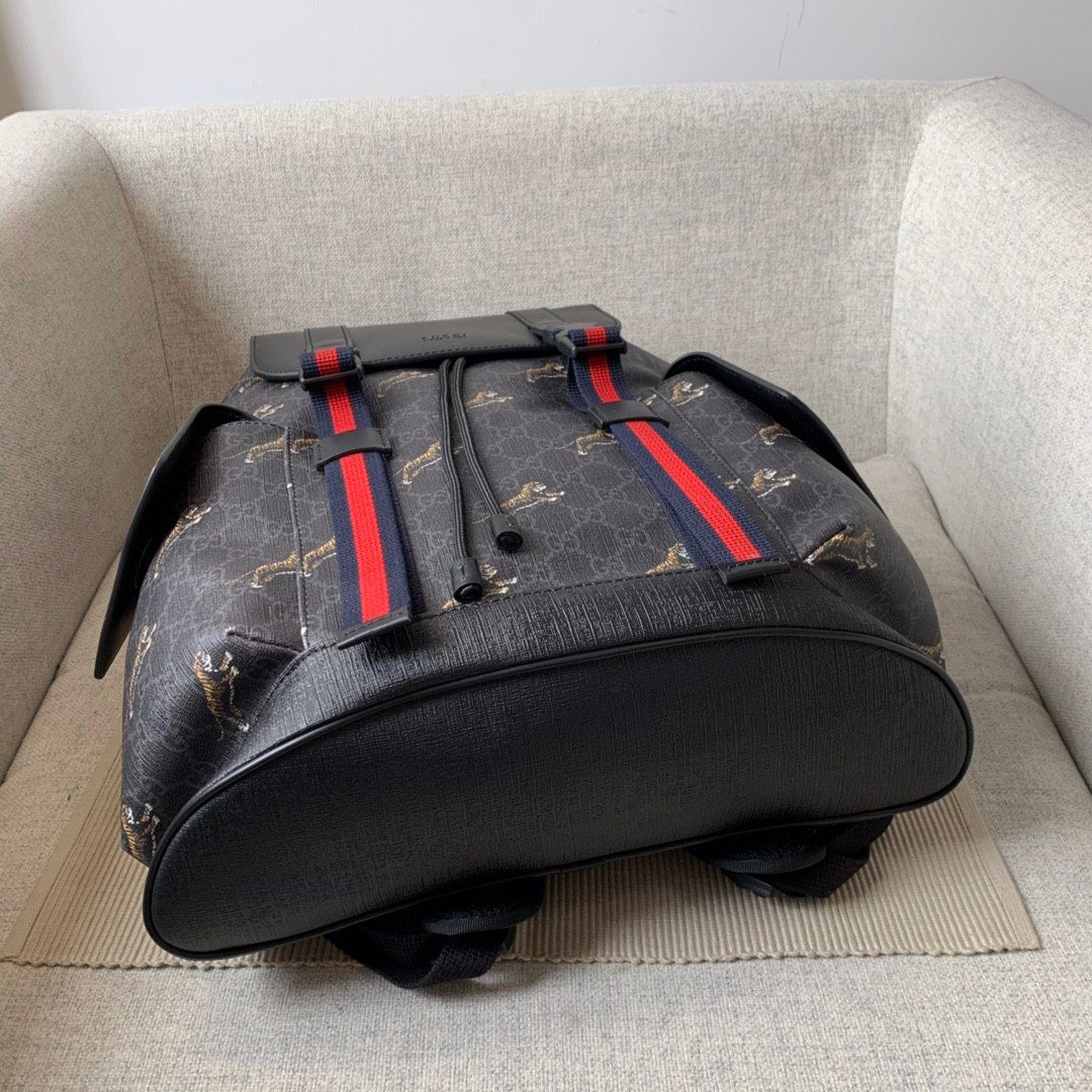 这款背包秉承严苛的制作标准,选用顶级的“原厂定制”皮革组件,确保呈现出极具真实感与奢华触感的佩戴体验。包身外观设计极具视觉冲击力:深色 GG Supreme 帆布底面上,精美地铺陈着充满动感的“跃虎”图案,呈现出一种错落有致的生动美感。这一大胆前卫的图案设计,在光滑的黑色皮革翻盖、与之呼应的侧袋翻盖以及坚固的皮革包底饰边的衬托下,显得既醒目又不失优雅沉稳。
