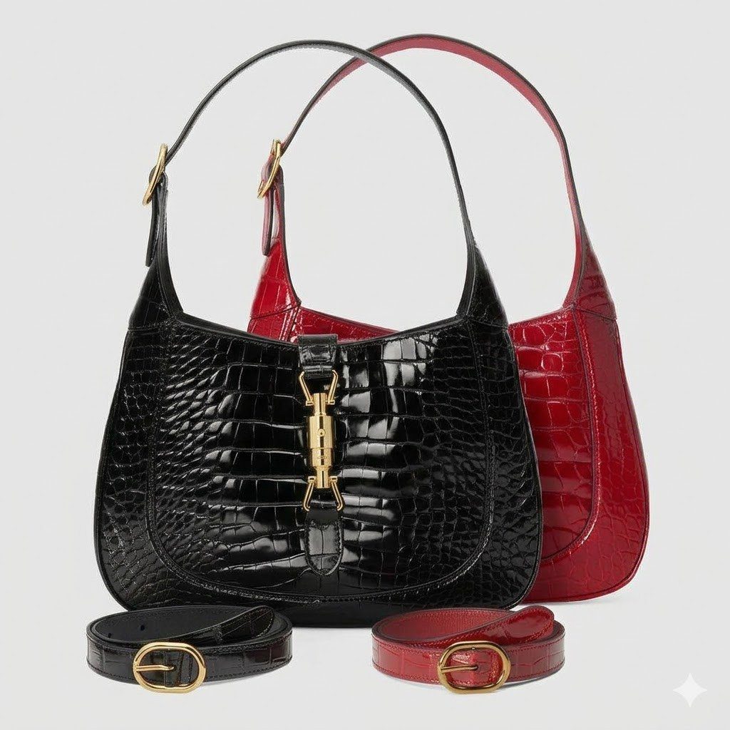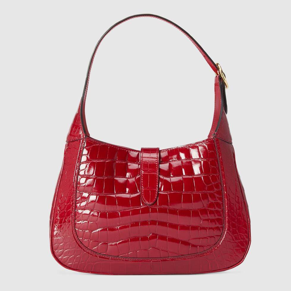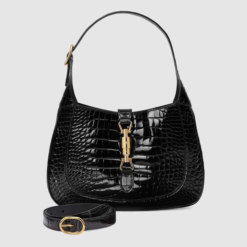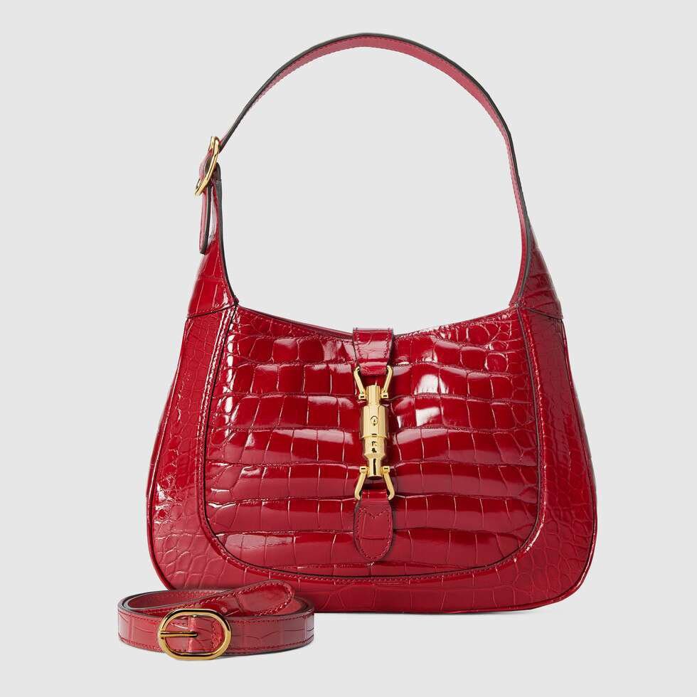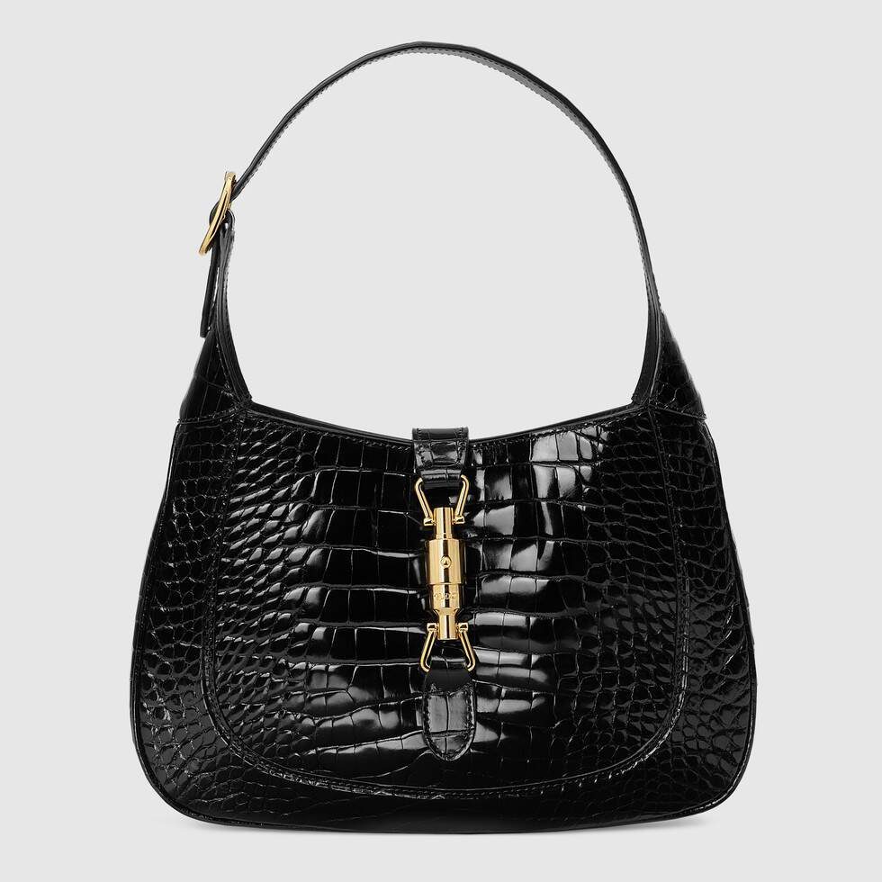 **精湛材质与设计:** 此款手袋选用高端定制的鳄鱼纹压花牛皮精制而成,呈现出细腻考究的纹理与奢华的光泽感。其设计保留了“Jackie”系列独有的经典魅力——标志性的半月形弧线轮廓,以及极具辨识度的金色活塞锁扣。