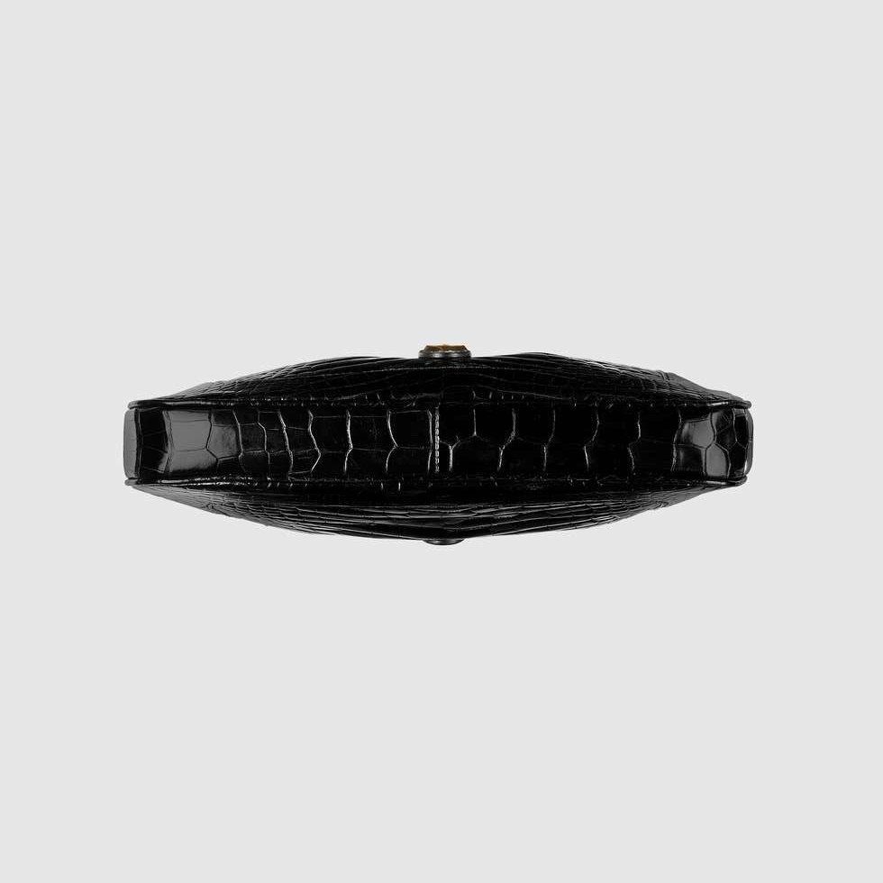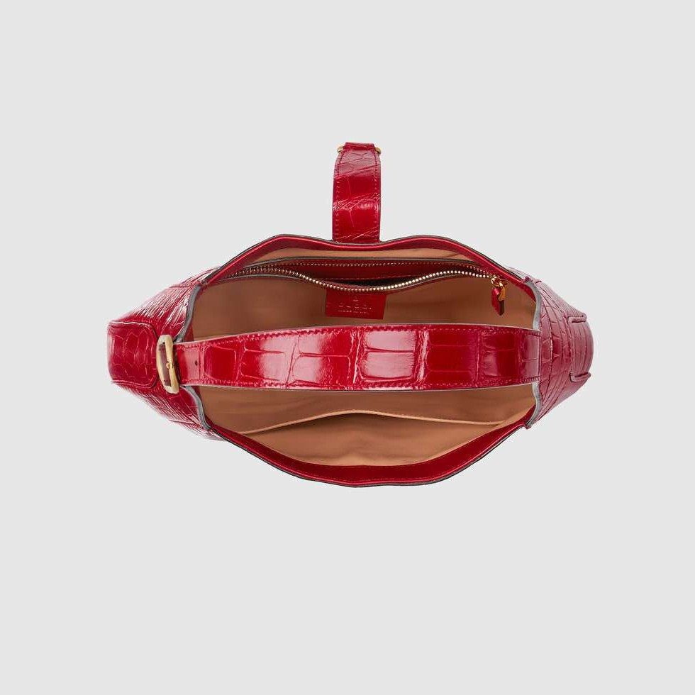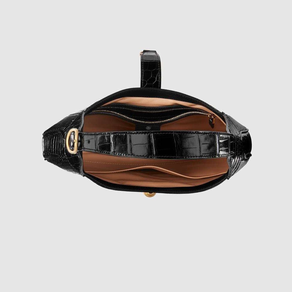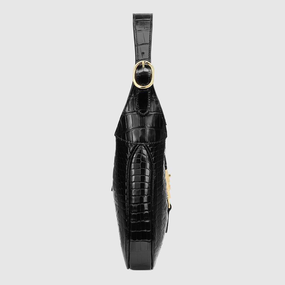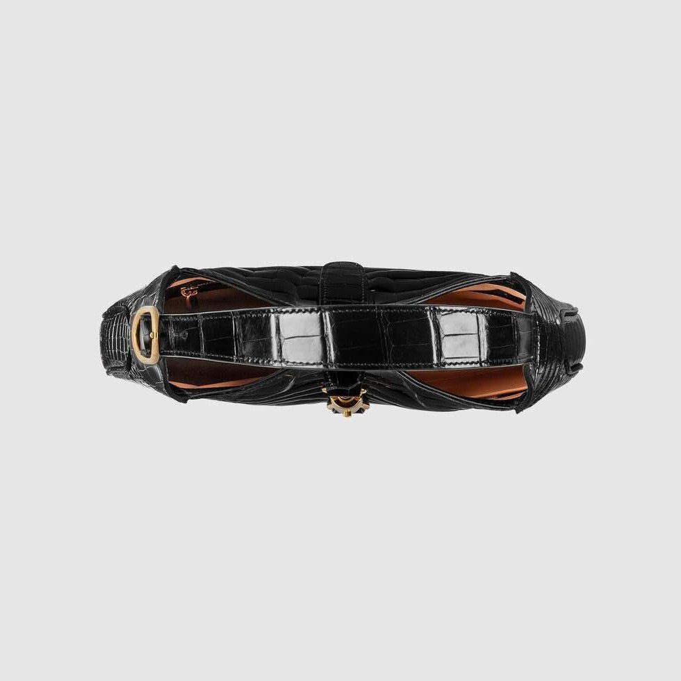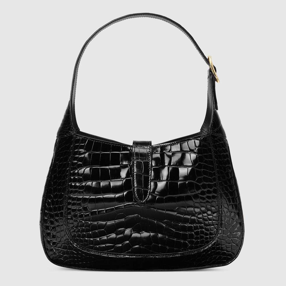 **精湛材质与设计:** 此款手袋选用高端定制的鳄鱼纹压花牛皮精制而成,呈现出细腻考究的纹理与奢华的光泽感。其设计保留了“Jackie”系列独有的经典魅力——标志性的半月形弧线轮廓,以及极具辨识度的金色活塞锁扣。