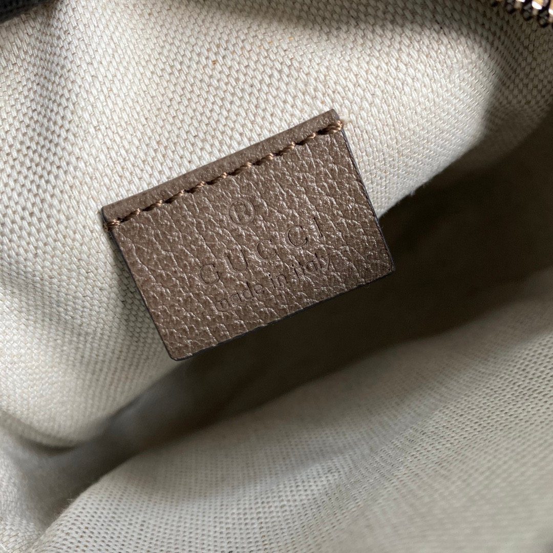 **标志性品牌元素与复古细节** 包身采用品牌标志性的米色与乌木色 GG Supreme 帆布制成,极具辨识度。其最引人注目的设计莫过于正面的椭圆形皮革饰牌,上面镶嵌着一枚金色金属猫科动物头像——这正是品牌对动物王国情有独钟的标志性象征。棕色皮革饰边与做旧质感的五金配件相得益彰,进一步升华了包袋的复古韵味。