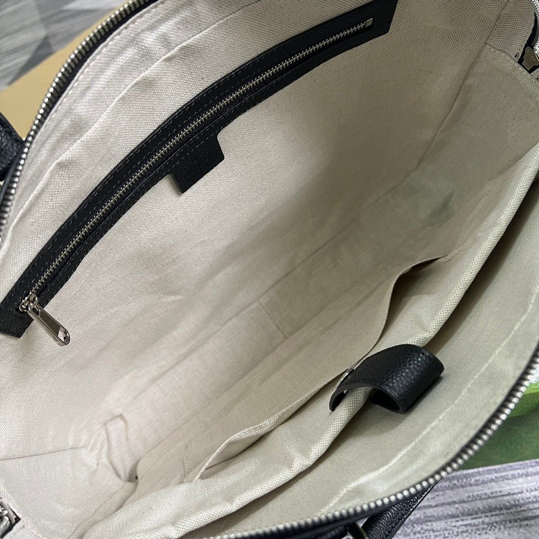 **优质皮革与极简设计** 这款包袋通体采用触感柔软的黑色皮革精制而成,其点睛之笔在于包身正面那精心压印的 Gucci 品牌标志——既彰显奢华质感,又不失低调内敛的风度。包袋内部的设计同样周到细致,选用了耐用且优雅的棉麻混纺内衬。