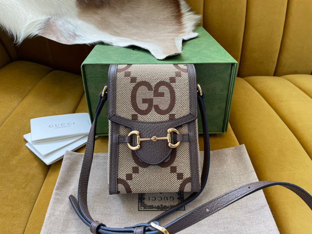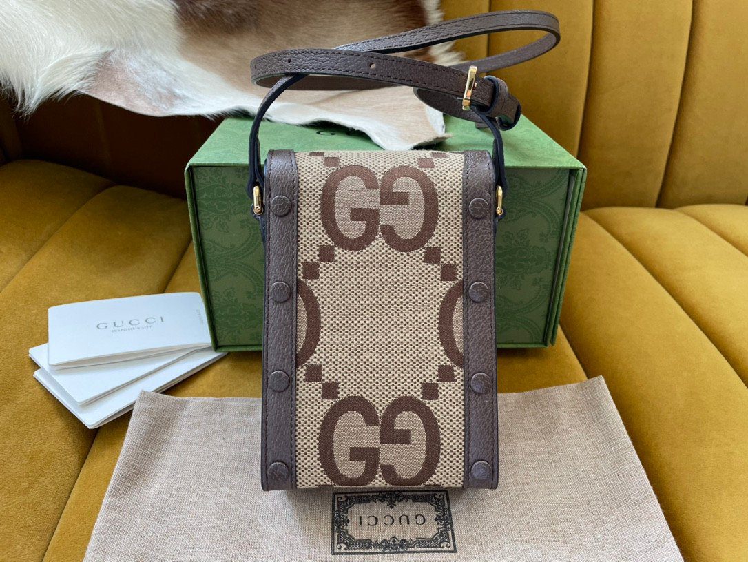**Jumbo GG:** 醒目的大号 GG 图案(驼色/乌木色帆布),搭配浓郁的棕色皮革饰边。