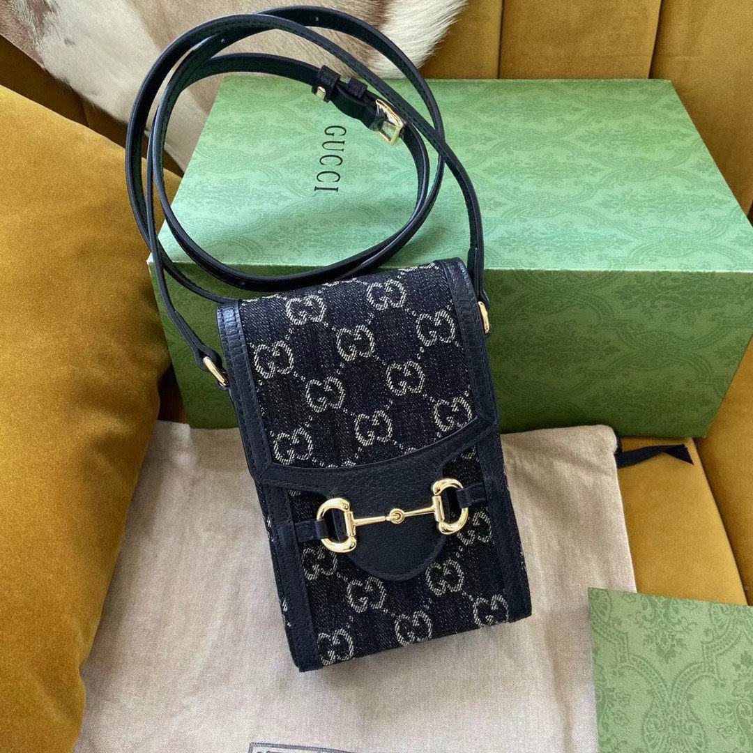 **Black GG Denim/Canvas:** 利落的单色调深灰/黑色 GG 图案,搭配同色系的黑色皮革饰边。