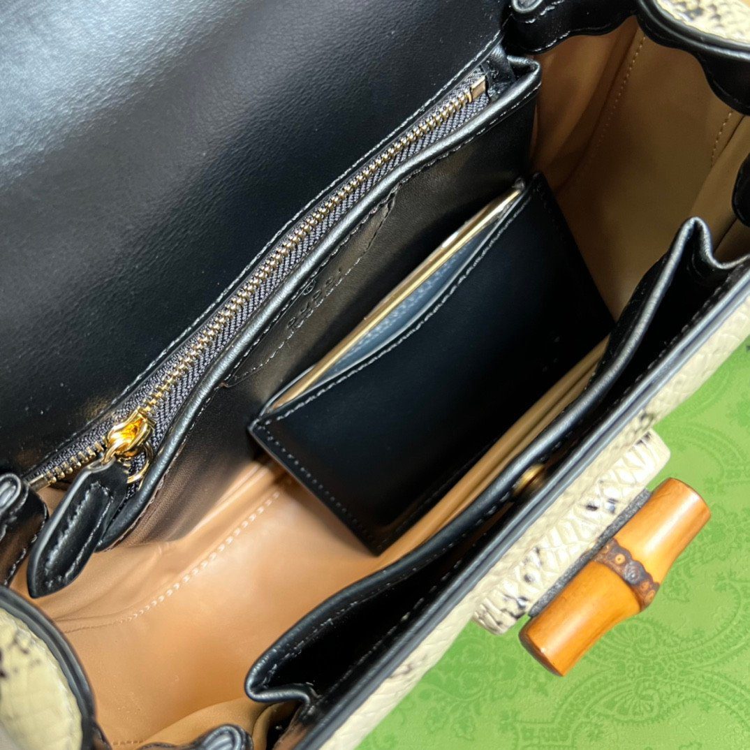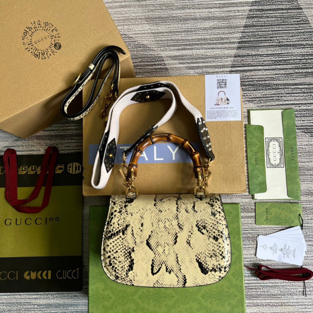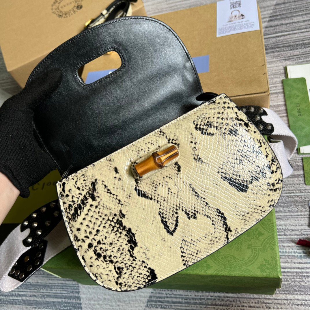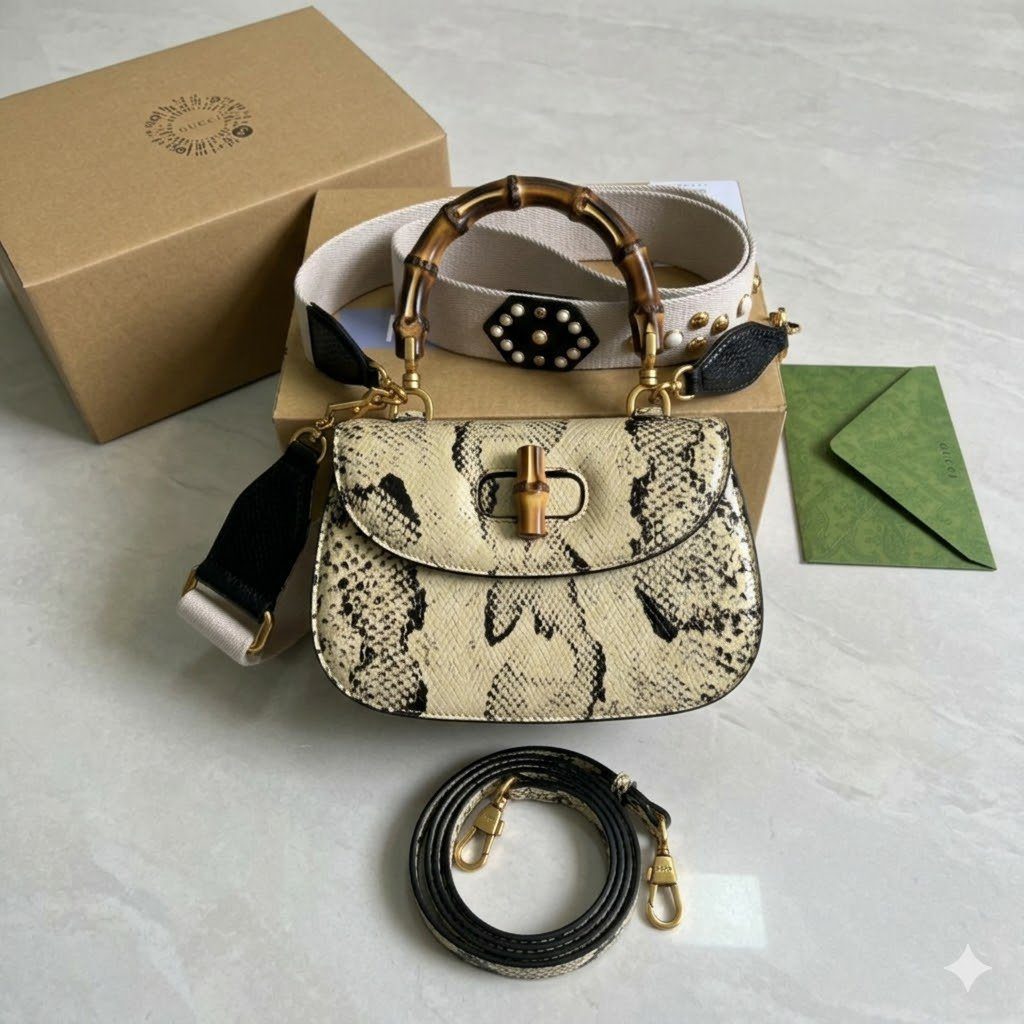 **异域风情工艺与标志性细节:** 这款小型手提包是奢华格调的完美宣言,它由特别定制并进口的白色蛇纹皮革精心打造而成,呈现出大胆而充满异域风情的独特质感。包身工艺精湛非凡,顶部饰有品牌历史悠久的弧形竹节手柄,前翻盖则配有与之呼应的竹节扭锁扣,确保安全且美观。所有金属配件均采用原厂五金,呈现出原汁原味的高级质感。