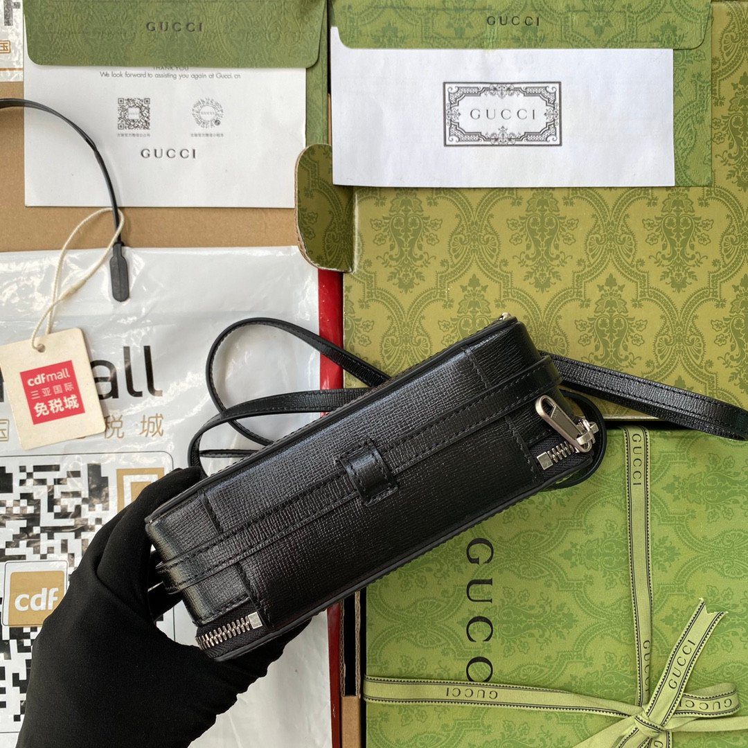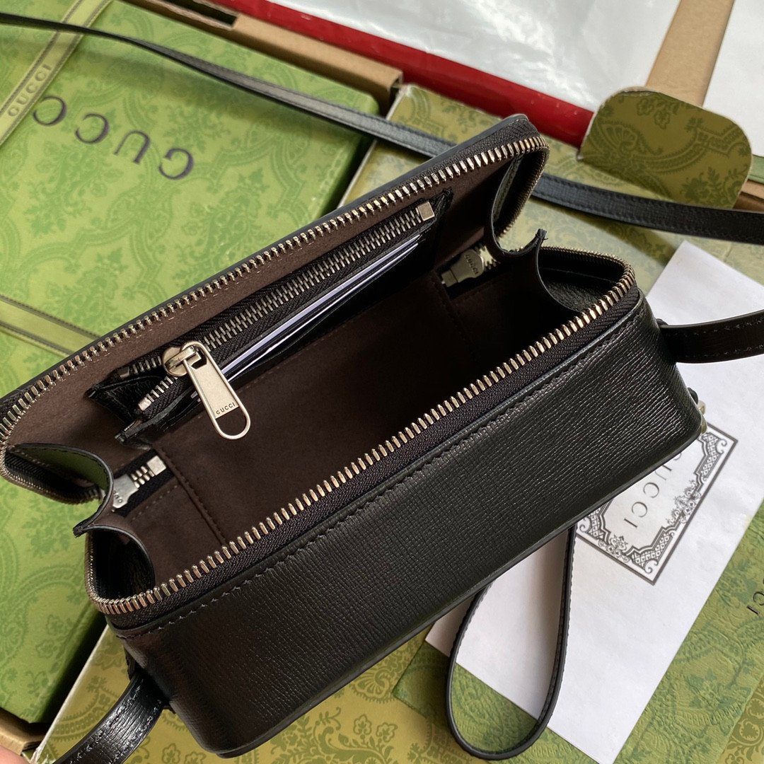 **标志性细节与日常实用性** 包身正面饰有一枚独具特色的椭圆形皮革贴片,其上压印着经典的互扣式双 G(Interlocking G)品牌标识。顶部配有顺滑易拉的拉链,确保您的随身物品安全妥善地收纳其中。为了满足轻松便捷的出行需求,包袋配备了一根纤细且色调一致的黑色皮革肩带,让您可以舒适且时尚地演绎斜挎或单肩背戴造型。
