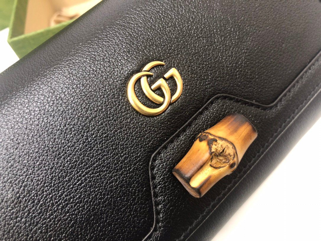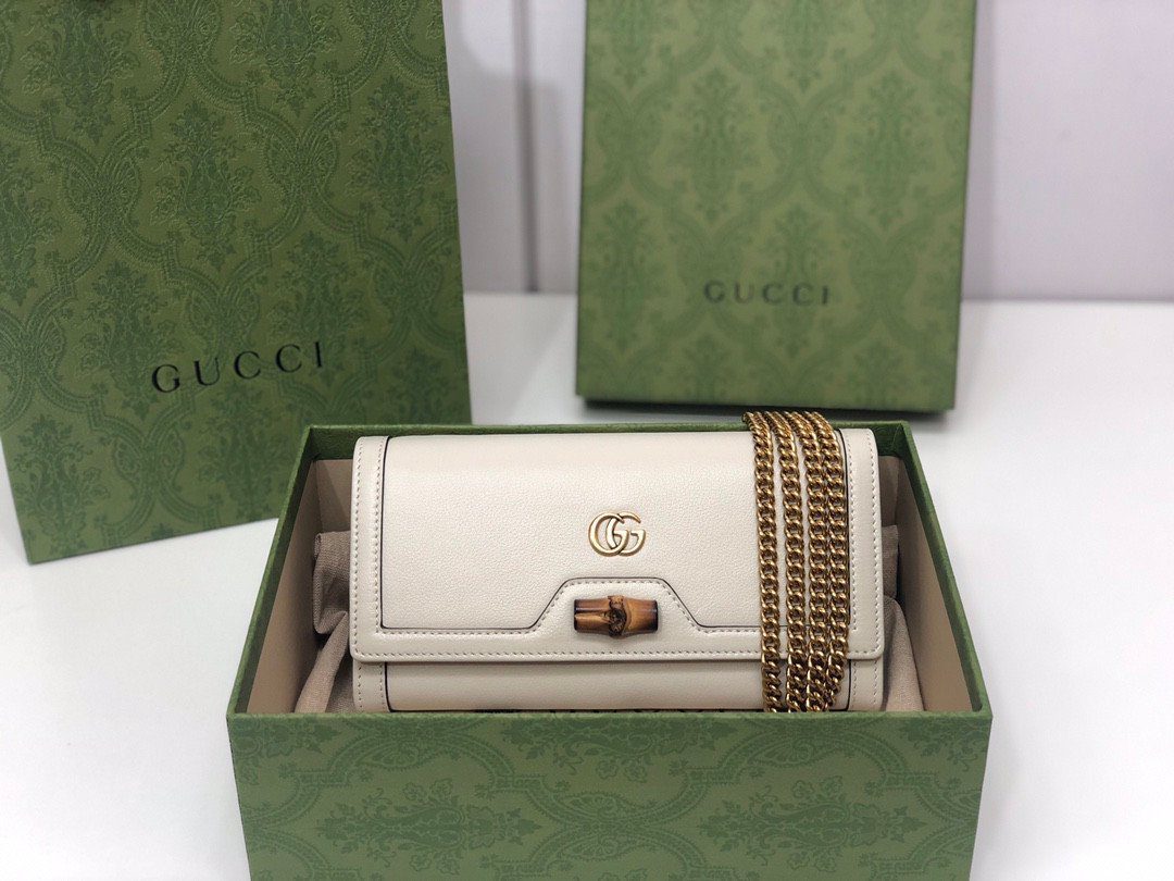 **精致设计与标志性五金** 采用优质光滑皮革精心打造,这款链条包呈现出流畅且精致的美学外观。包身前翻盖饰有经典的金色调双 G(Double G)字母交织图案五金,优雅地置于独特而别致的竹节扣饰上方。包身配有一条精致的金色调链条肩带,让您可以轻松实现单肩背、斜挎,亦可将链条收纳至包内,作为传统手拿包使用。