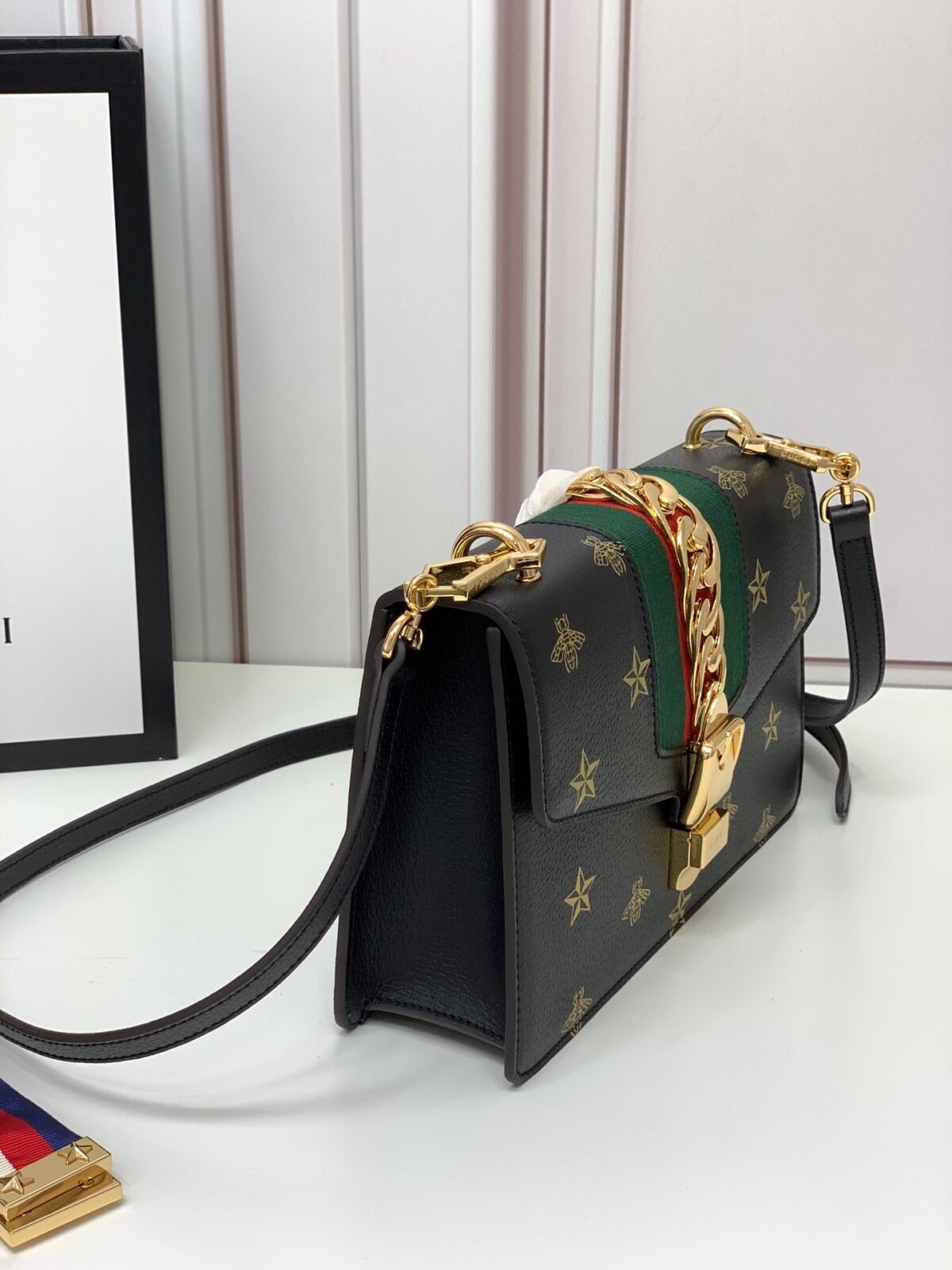 **标志性五金与细节** 设计的一大亮点在于其显著采用了正宗的“原厂”五金配件,为包袋增添了一抹无可争议的顶级奢华气息。包身正面以经典的红绿织带(Web stripe)为核心装饰,其上优雅地叠压着一条抛光金色链条,并配有一个独具特色、光泽璀璨的搭扣锁扣。