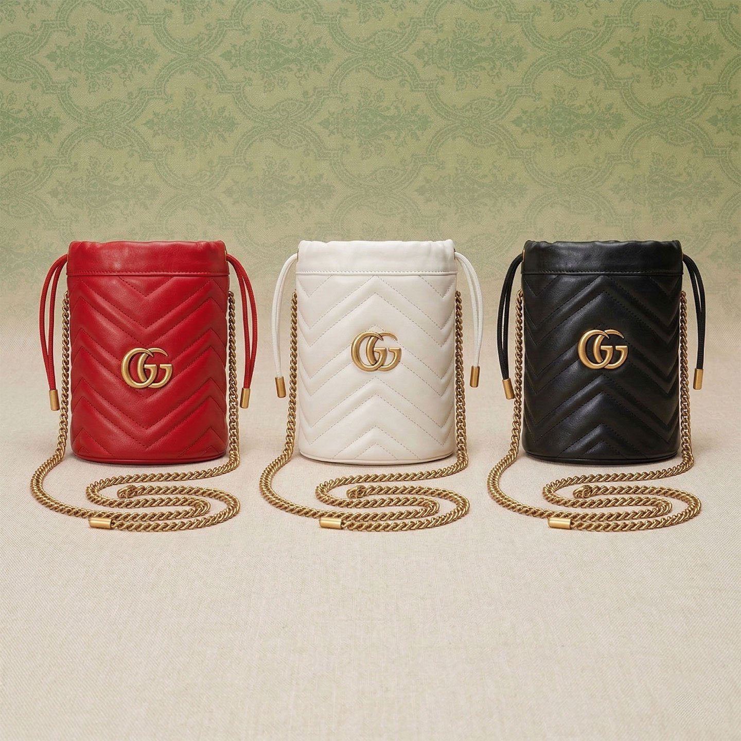 **核心设计元素:** V 形绗缝纹理,金色双 G 金属配件