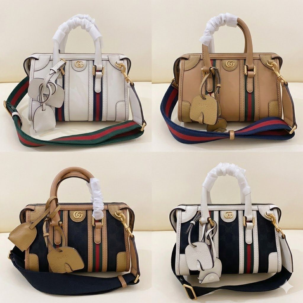 **驼色/棕褐色:** 温暖经典的复古风格,采用色泽饱满的棕褐色皮革,饰有红绿配色纵向织带条纹,并搭配一条蓝红配色宽肩带。