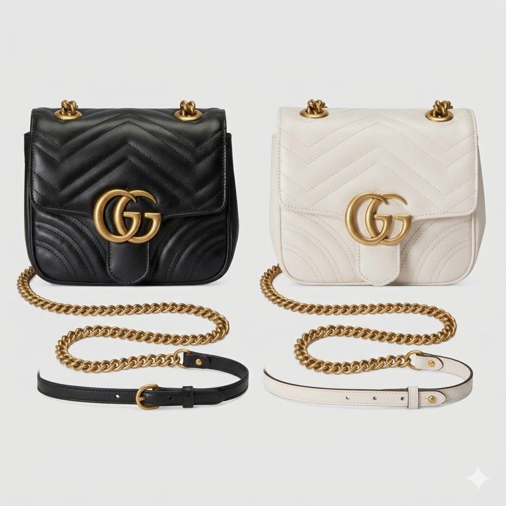 **标志性五金与可选配色**——包盖正面饰有辨识度极高的做旧金色双 G(Double G)金属扣饰,赋予了整款包袋独特的复古美学风格。为了完美契合您客户多样化的穿搭需求,这款人气极高的迷你包特别推出了两种永恒经典的配色: