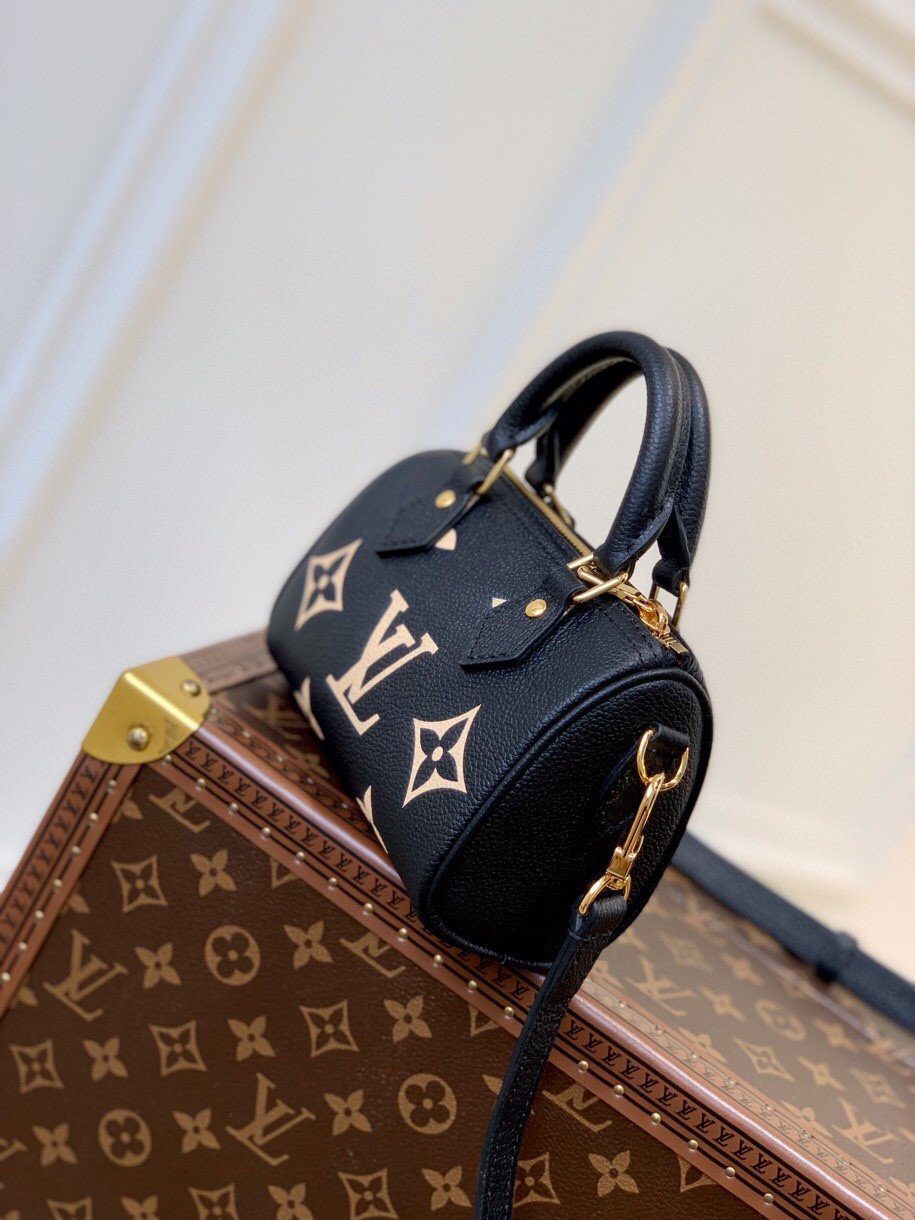 路易威登(Louis Vuitton)Nano Speedy 手袋助您尽显极致女性魅力;它是品牌标志性 Speedy 手袋的完美微缩版本。经典款 Speedy 素以 Monogram 帆布材质著称,而这款惊艳新作则通过选用优质全皮材质,将设计提升至全新境界——其皮革表面饰有触感细腻的浮雕式 Monogram 图案,并辅以对比鲜明的丝网印花工艺加以点缀。