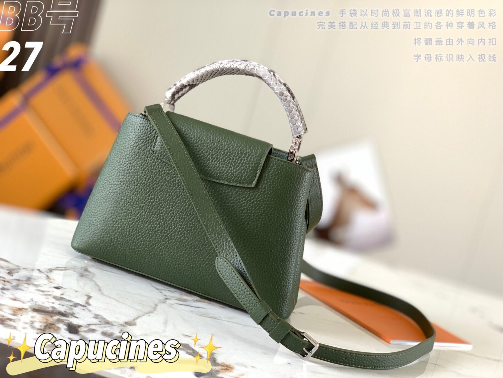 路易威登 Capucines BB 手袋堪称集精致奢华与考究设计于一身的杰作。此款手袋选用上乘的全粒面 Taurillon 牛皮精制而成,通过在手柄及标志性 LV 字母标识处点缀珍稀天然蟒蛇皮细节,进一步升华了 Capucines 系列的经典轮廓。