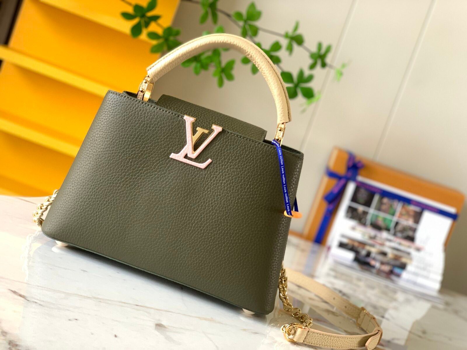 富有大地气息的橄榄绿色调,辅以柔和的米色手柄及淡粉色的 LV 标志细节装饰。
