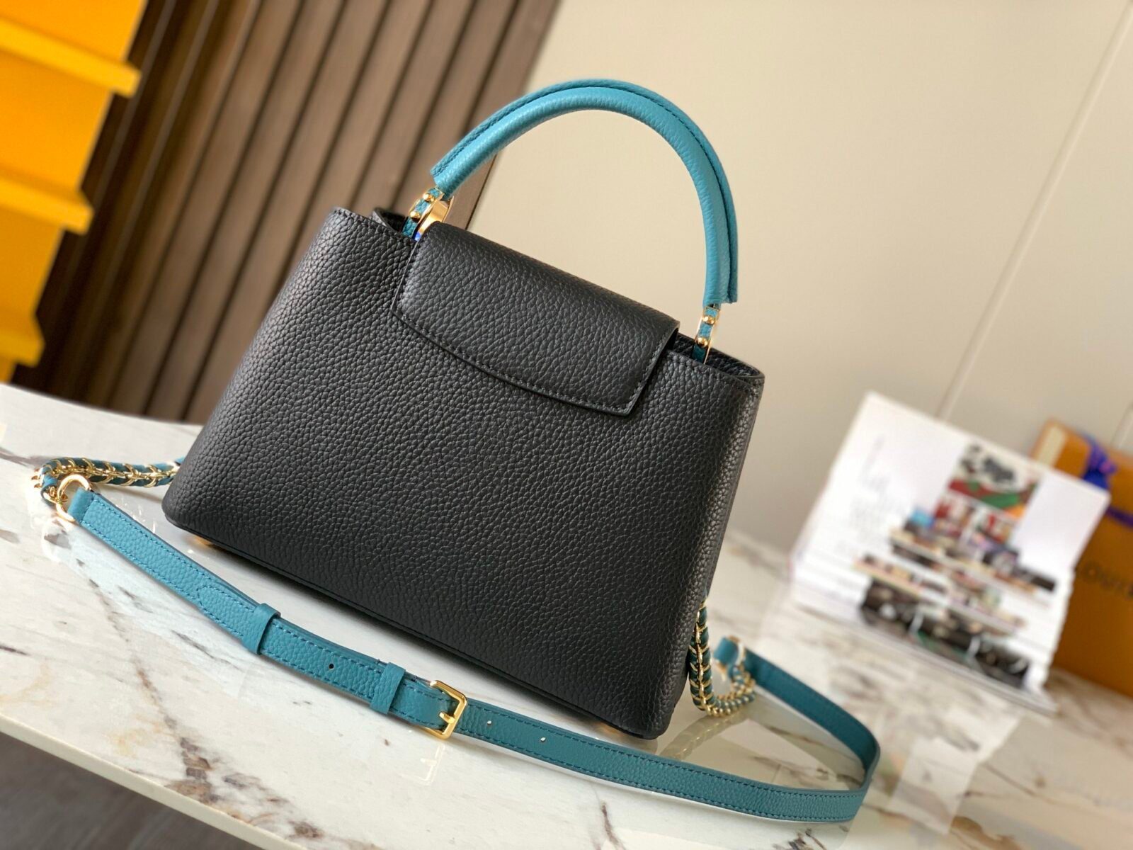 令此款手袋尤为出众的,在于其精妙绝伦的肩带设计细节。它配有一条工艺精湛的皮革编织链条肩带,不仅长度可自由调节,更可随心拆卸。这一设计让您能够轻松切换背携方式:无论是优雅的手提、舒适的单肩背,还是解放双手的斜挎,皆可无缝衔接,尽显百变风范。正如所有经典的 Capucines 手袋一样,其前翻盖设计提供了双重造型选择:您可以将翻盖内收,从而醒目地展示标志性的 LV 字母标识;亦可将翻盖外翻,呈现更为低调内敛的风格,隐约流露出一朵精致的 Monogram 花卉图案。