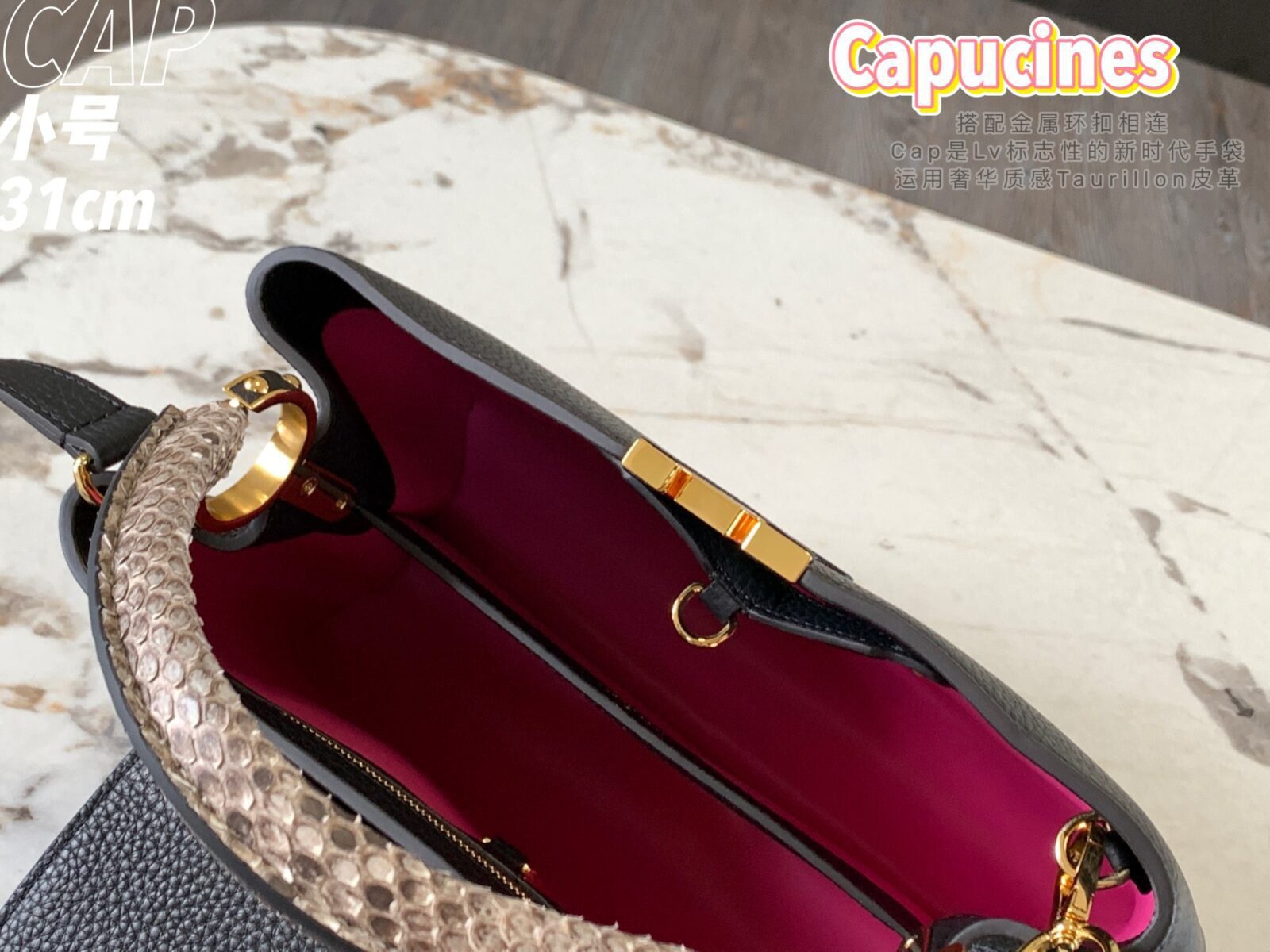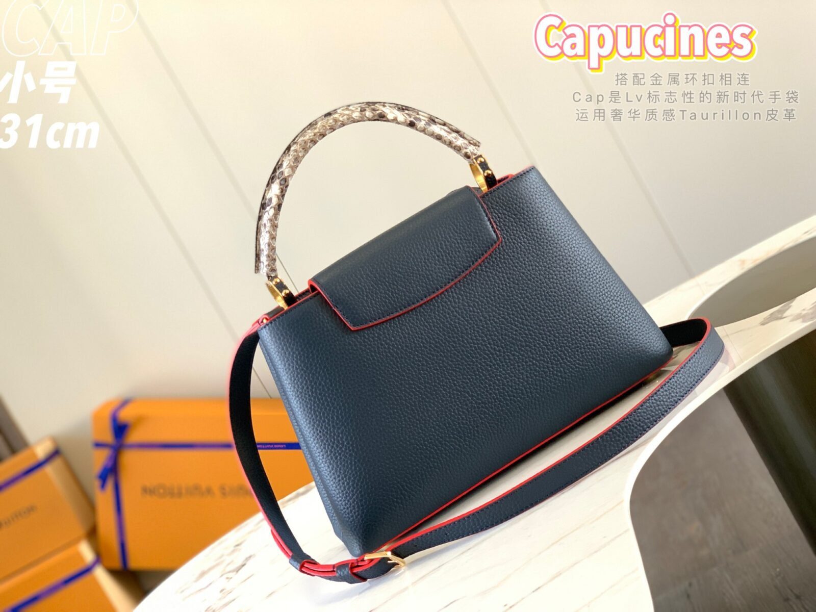 Capucines 手袋得名于巴黎的卡普西纳街(Rue des Capucines)——路易威登(Louis Vuitton)正是在此开设了其首家专卖店。作为一款永恒的经典杰作,它旨在为任何造型注入无与伦比的优雅与精致格调。这款极致奢华的特别版手袋,由工匠大师采用优质进口全粒面 Taurillon 牛皮精心打造——皮面呈现出迷人的荔枝纹理——并配有一条精美宽阔的珍稀蟒蛇皮手柄,尽显尊贵非凡。